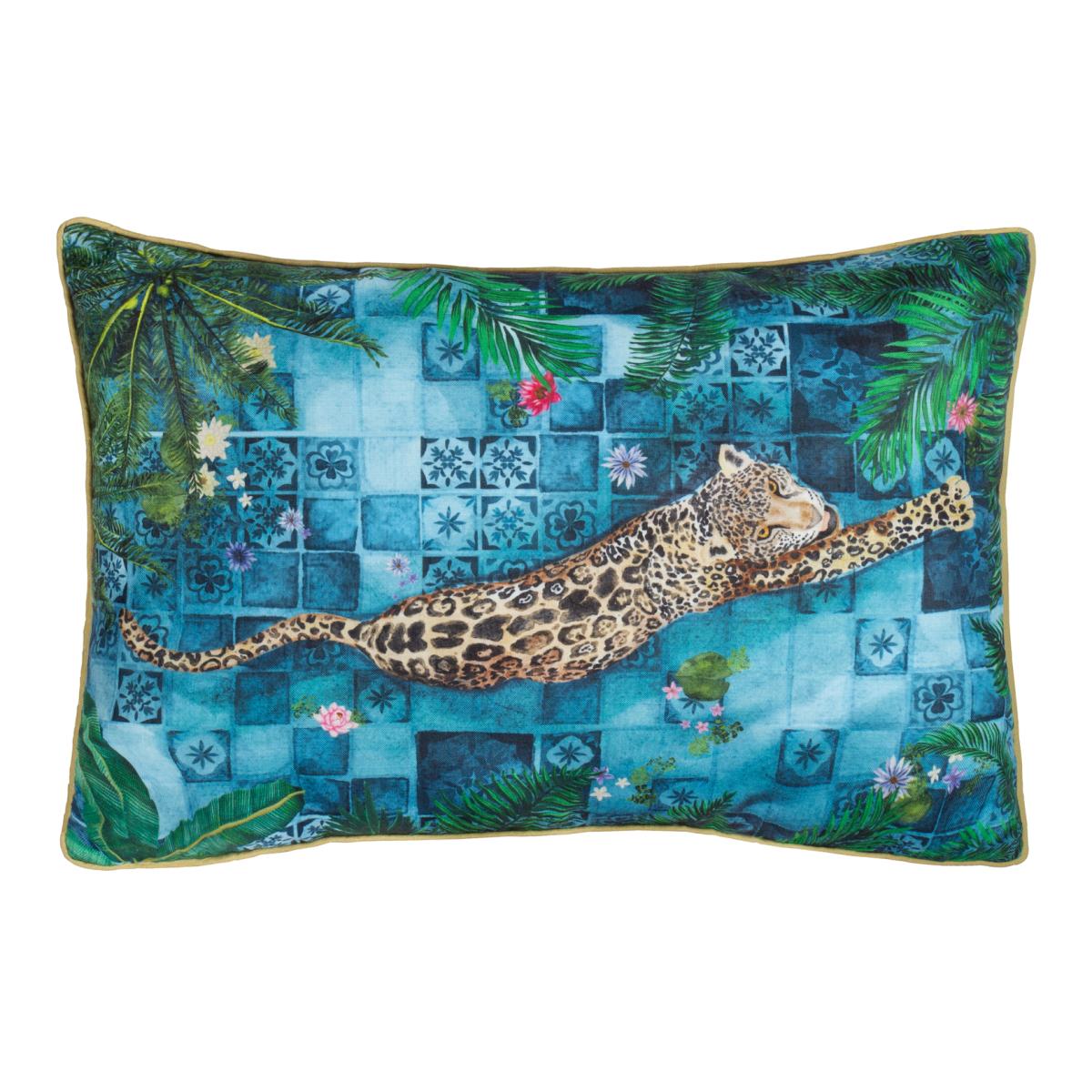 Elevate your outdoor space with the Majorelle Leopard Moroccan Piped Outdoor Cushion, a masterpiece of luxury and detail. This cushion features a hand-painted design capturing a majestic leopard gliding through the serene waters of a Moroccan Riad, framed by intricate tiles and lush palms. The soft-touch material, specially treated for outdoor durability, promises both style and resilience. Matching piping adds a refined finish, ensuring every detail is considered. Ideal for those who cherish artisanal craftsmanship and seek elegance in their surroundings, this cushion transforms any setting into an oasis of calm and sophistication.
