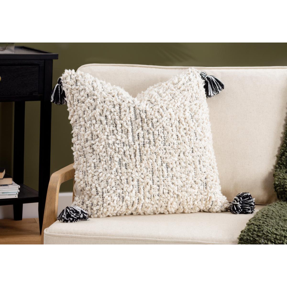 Cool, contemporary and unbelievably soft, our Makani cushion channels boho style thanks to its cotton boucle cover accentuated with corner tassels and 100% feather filling. Why you'll love it Our Makani feather cushion brings home boho chic style. Soft boucle fleece cover in 100% cotton. Contrasting two-tone corner tassels. Perfect for an eclectic bohemian living space. 100% feather filling. Cover is removable and machine washable at 30C. This cushion is part of the Furniture Village home accessories collection. What you need to know 100% cotton cover. Feather filling. For indoor use only. Plump regularly. Some fabrics can show wear on areas of more use or in direct sunlight. Clean regularly using a soft brush or vacuum with the curtain attachment. Deal with any spills promptly. Professional cleaning advised for oil- and grease-based stains. Please read our upholstery care guide for more advice. Dimensions Height: 50 cm (20 in). Width: 50 cm (20 in). Item code: MAKACUSH--001