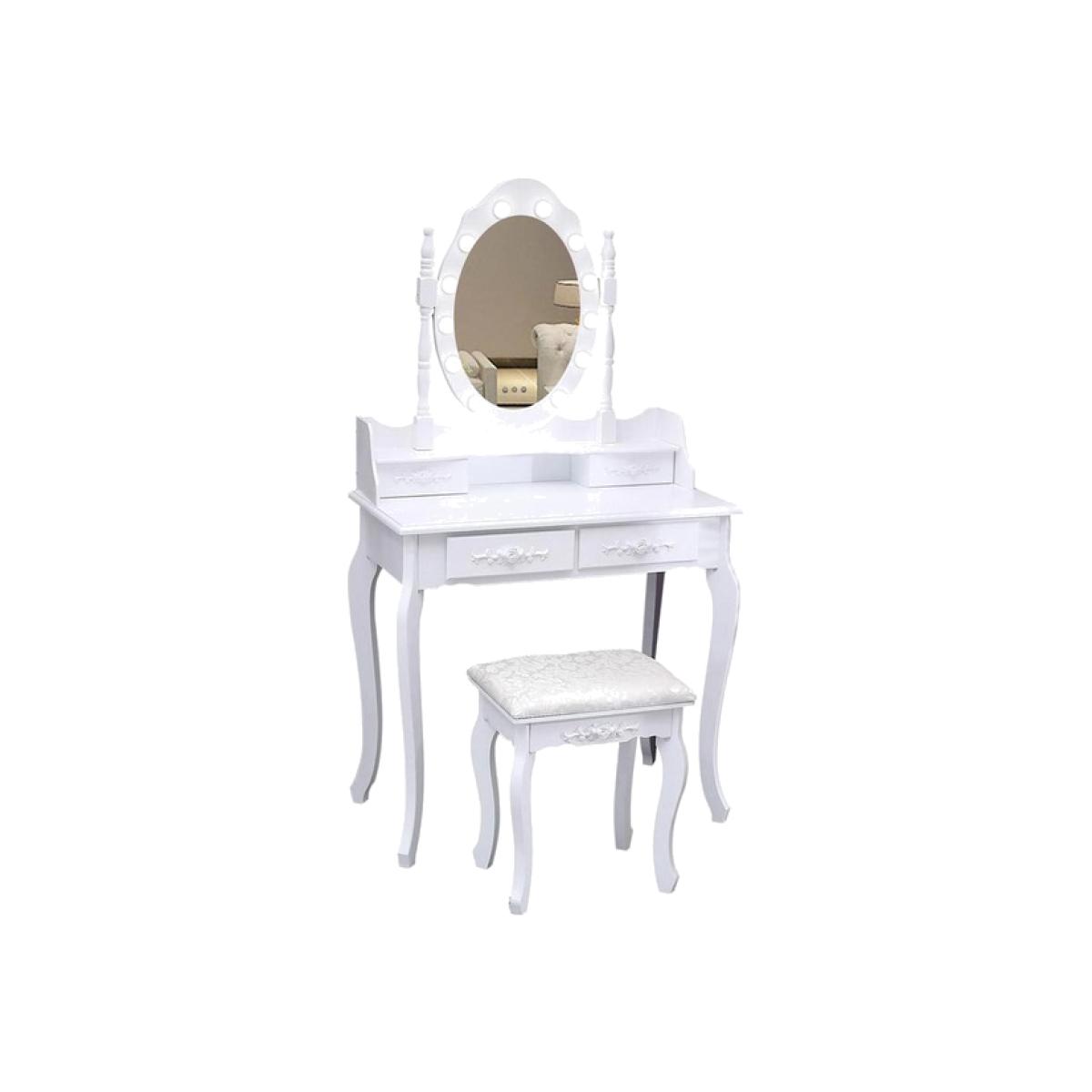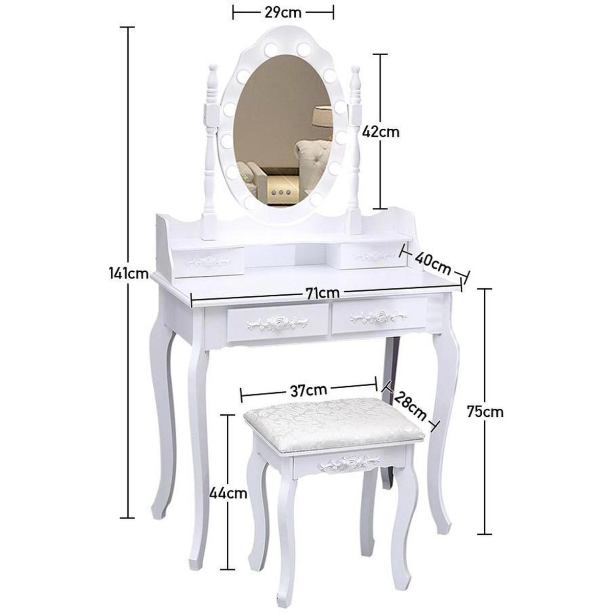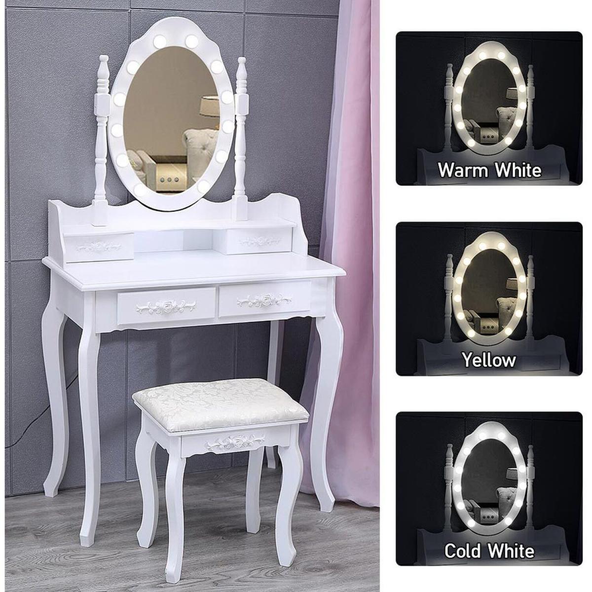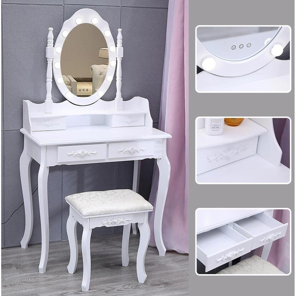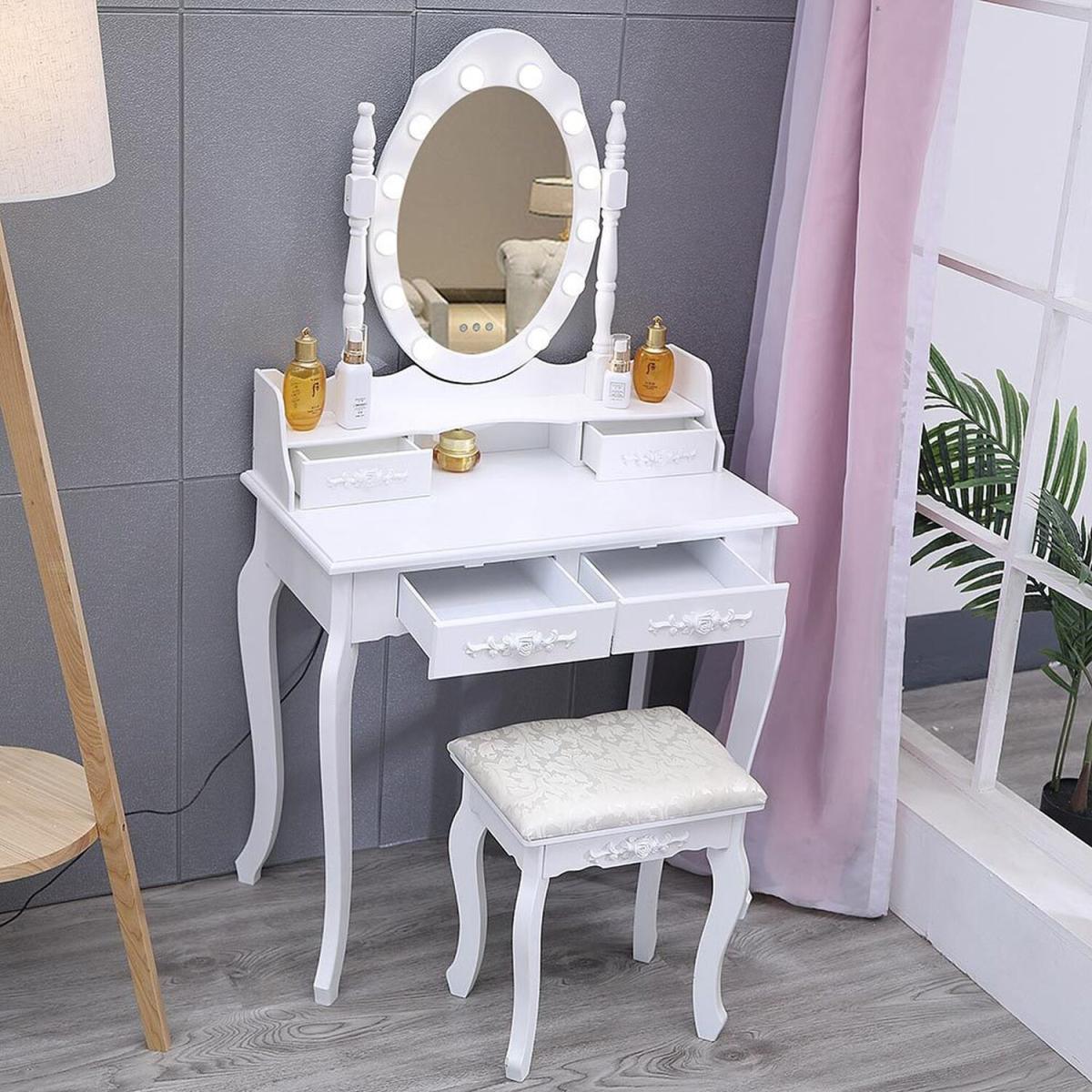 Say goodbye to makeup flaws that can't be seen in a single dull sconce and admire your outfit in the large, round mirror of this dressing table with its 12 dimmable light bulbs, oh yes, you look really great. With clean lines, an elegant white table surface, and a large mirror with light bulbs, this makeup table is an ideal gift for your sweetheart, who will certainly not hesitate to fill up their new dressing table.