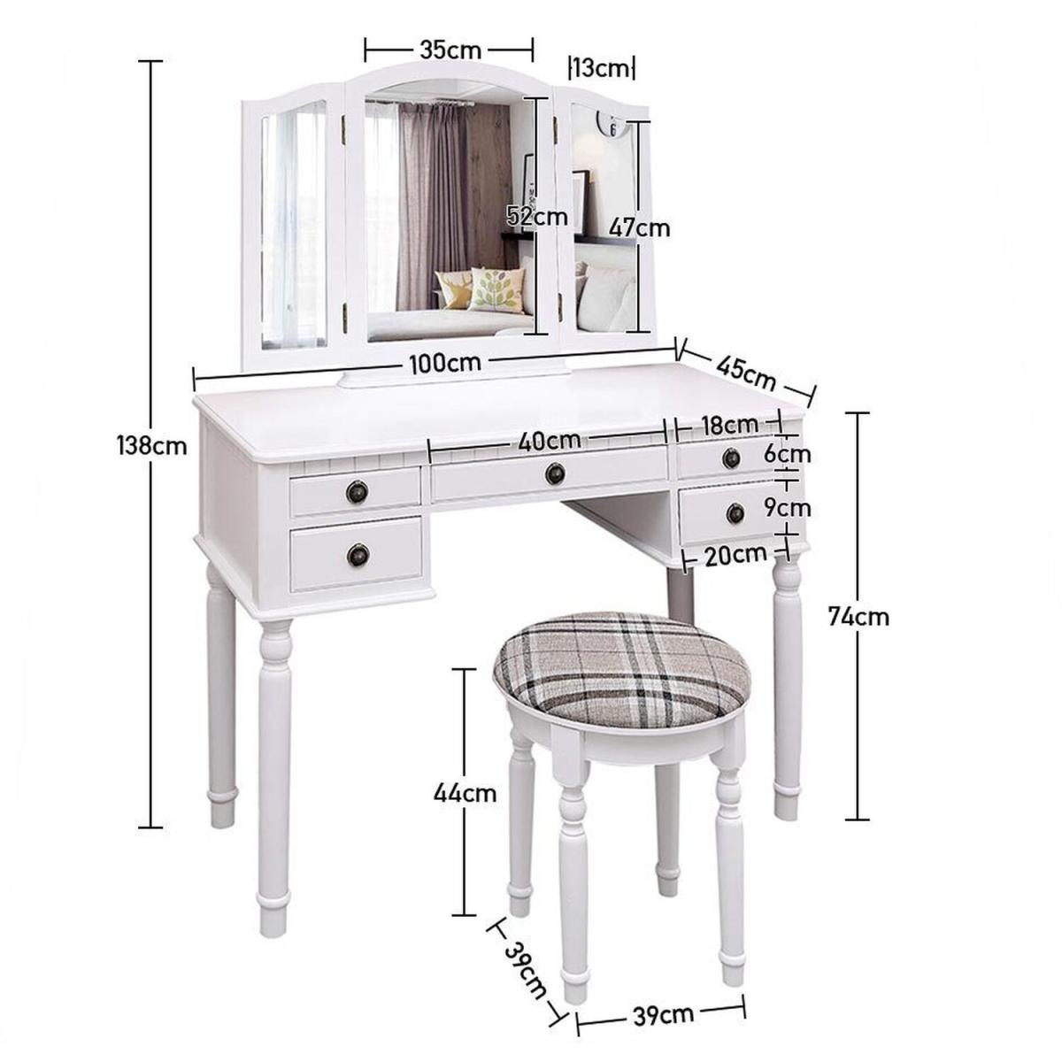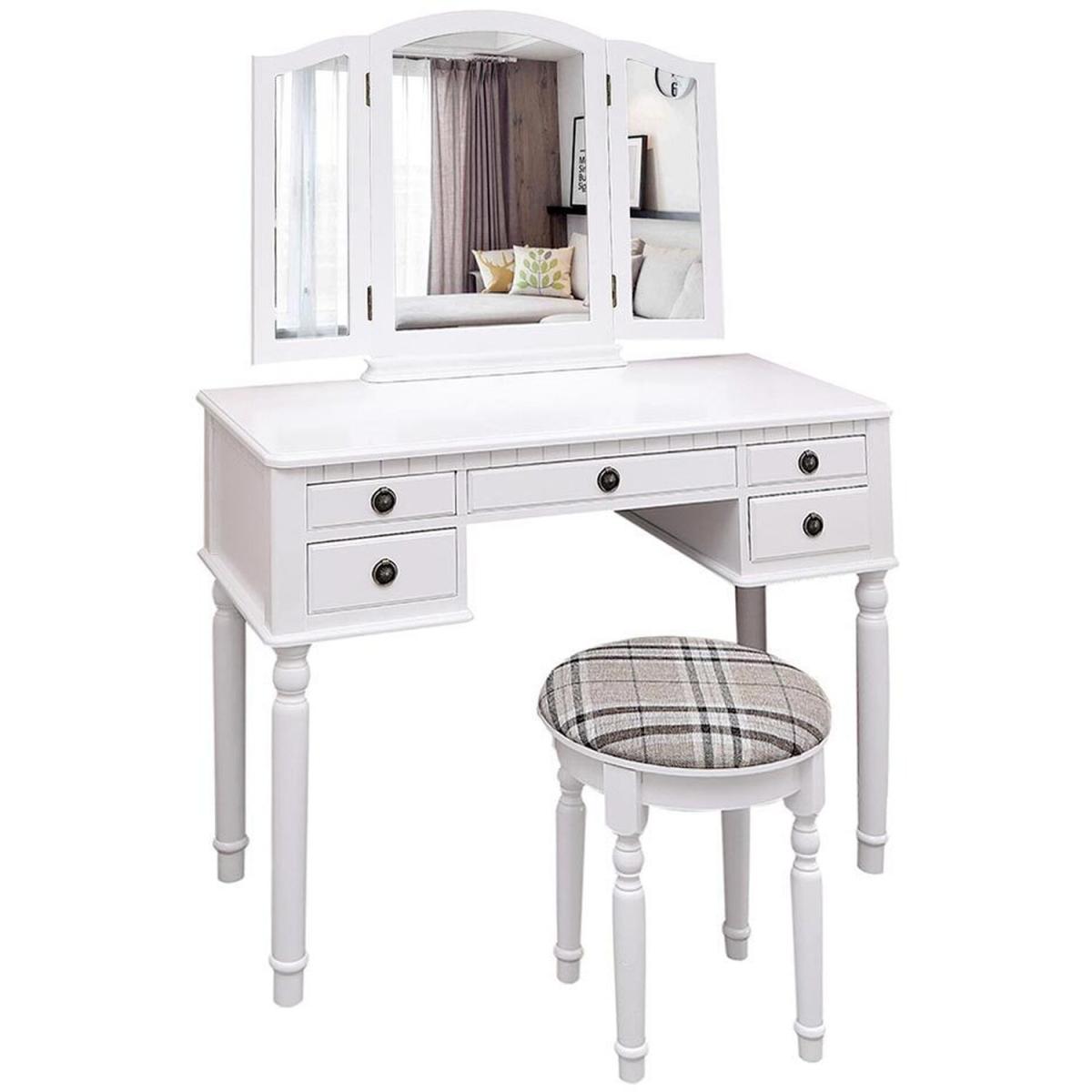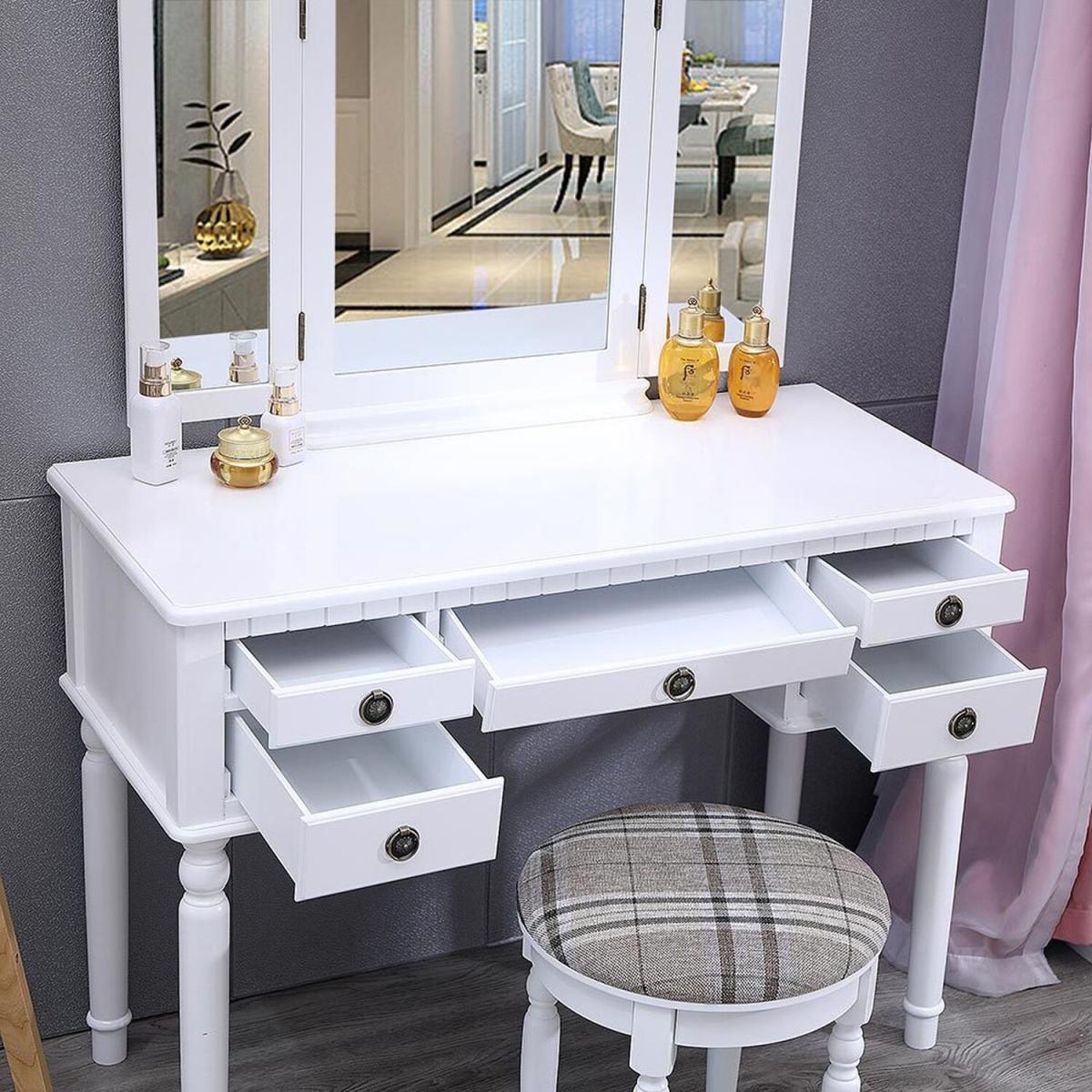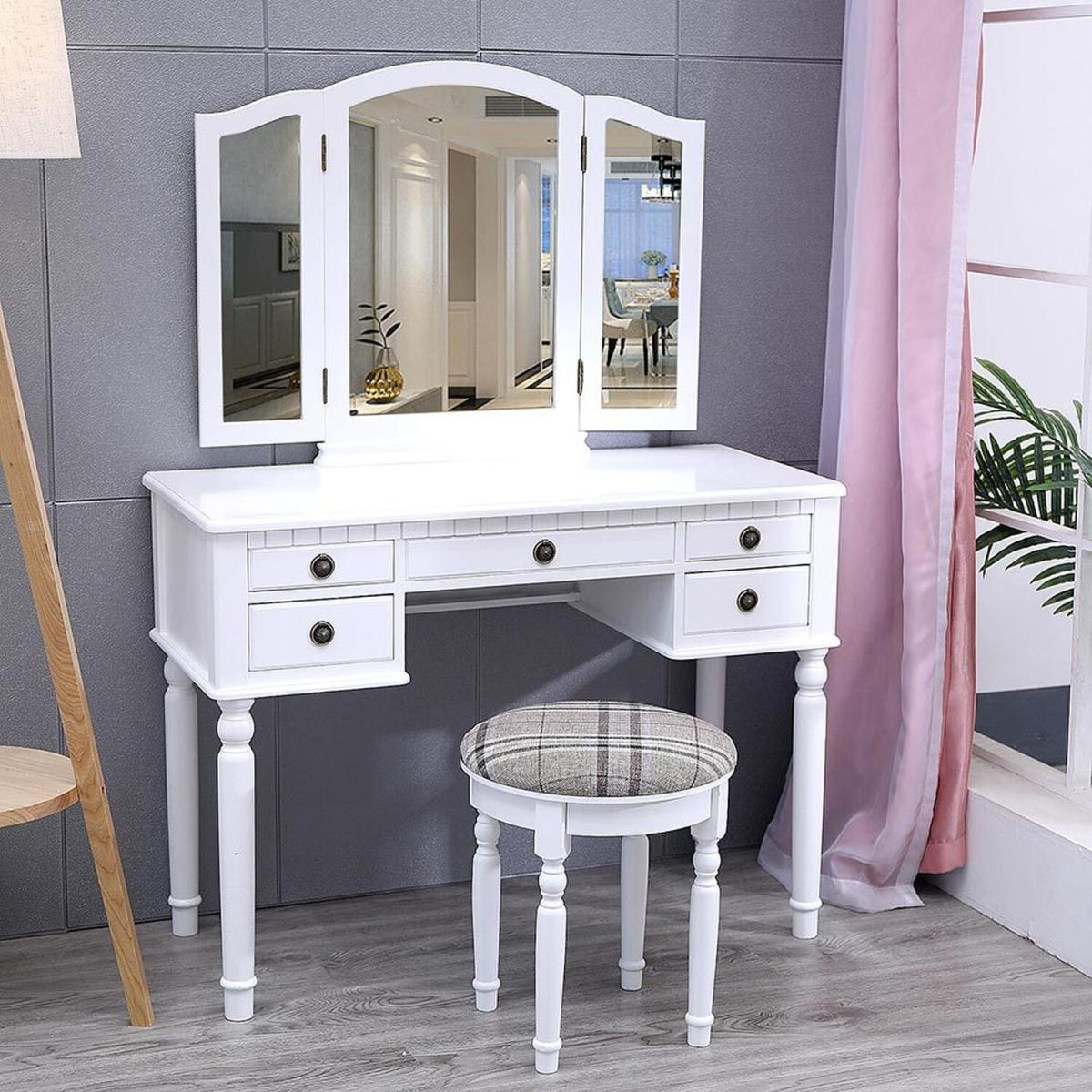 5 Drawers organize all your beauty secret and jewellery with ease, thanks to the large table surface , even with table top drawers sitting on top, there is still more than enough room on the table. Folding mirror offers a full view so you can make sure you look great from every angle. The classy looks and solid construction means it would last well over time.