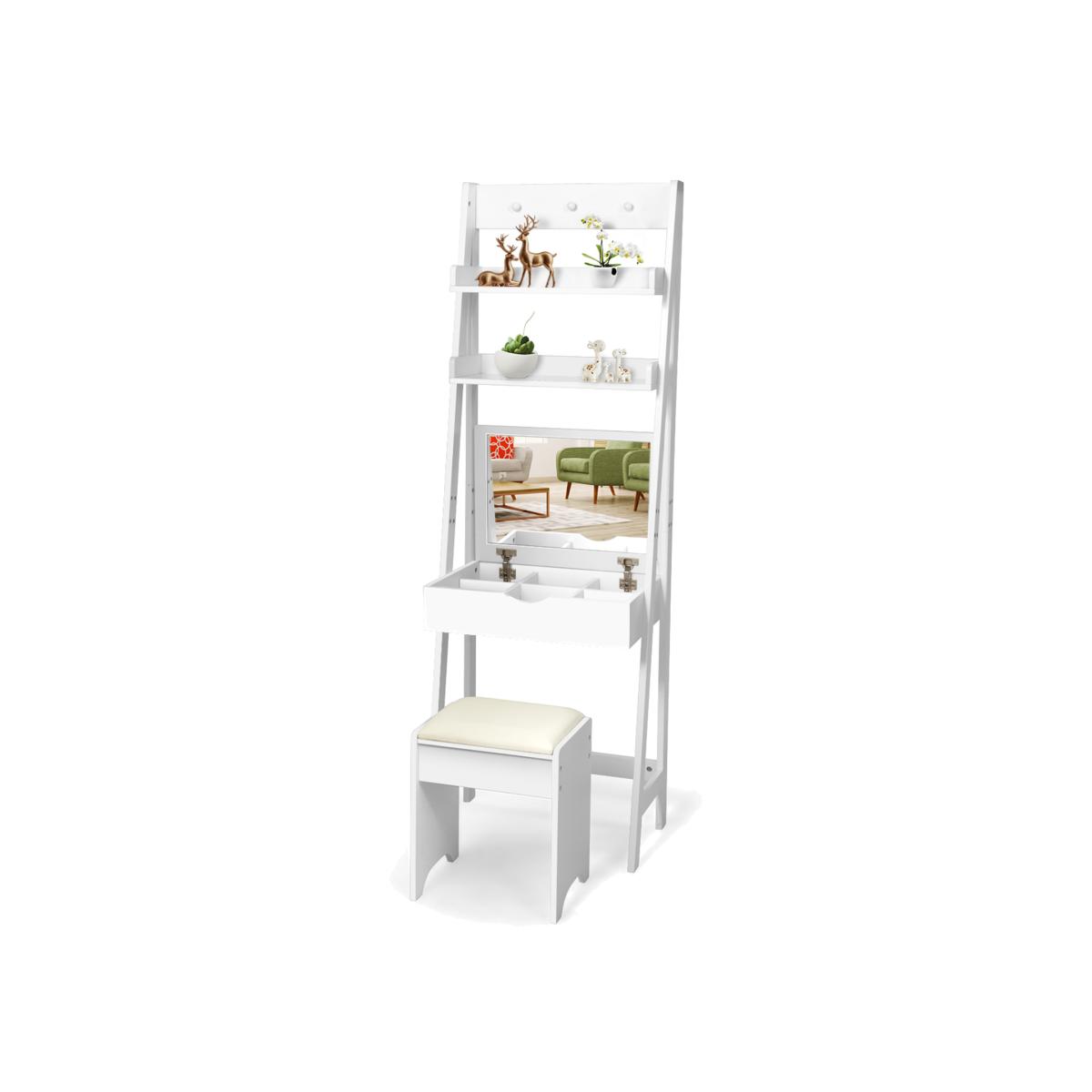 Are you still looking for a surprisingly versatile dresser to start your day? This is our high-quality vanity table set with a large capacity and multiple functions. It is made of high-quality MDF to improve durability and give you an extremely long service life. Multilayer storage design extends the space vertically. 6 neatly arranged storage compartments, 2 shelves and 3 hooks provide plenty of storage for your cosmetics, books, hats and other accessories. High-definition and large-size mirrors allow you to have a wider view when checking your makeup. The flip-top design allows it to transform into a laptop desk or writing desk in a few seconds, while it also serves as a simple small bookcase and bedside table. Soft stool allows you to sit for a long time without feeling tired. This vanity table set with exquisite craftsmanship and an elegant white appearance is a good decoration for your room.