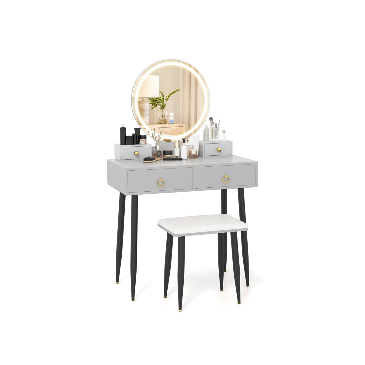 Enhance your daily routine with this dressing table set. This makeup table features an LED lighted mirror offering adjustable brightness and 3 colour options to suit your needs. You can stay organized with a spacious tabletop, 2 small tabletop drawers and 2 large drawers. The sleek legs are equipped with adjustable foot pads for enhanced stability. This stylish and practical dressing table set makes a perfect gift for loved ones on special occasions, combining functionality and elegance beautifully.