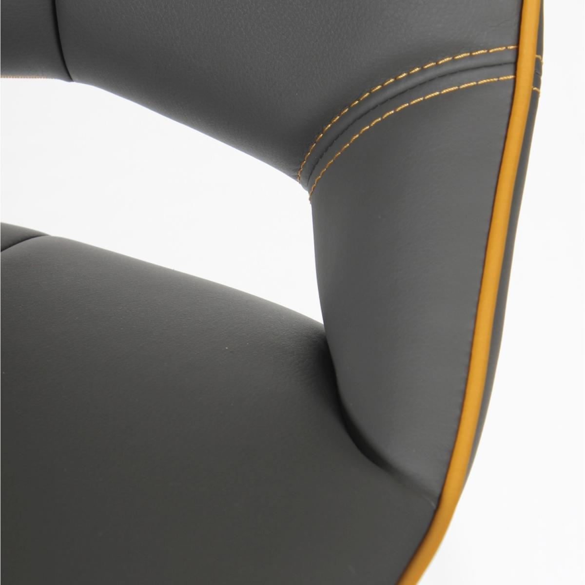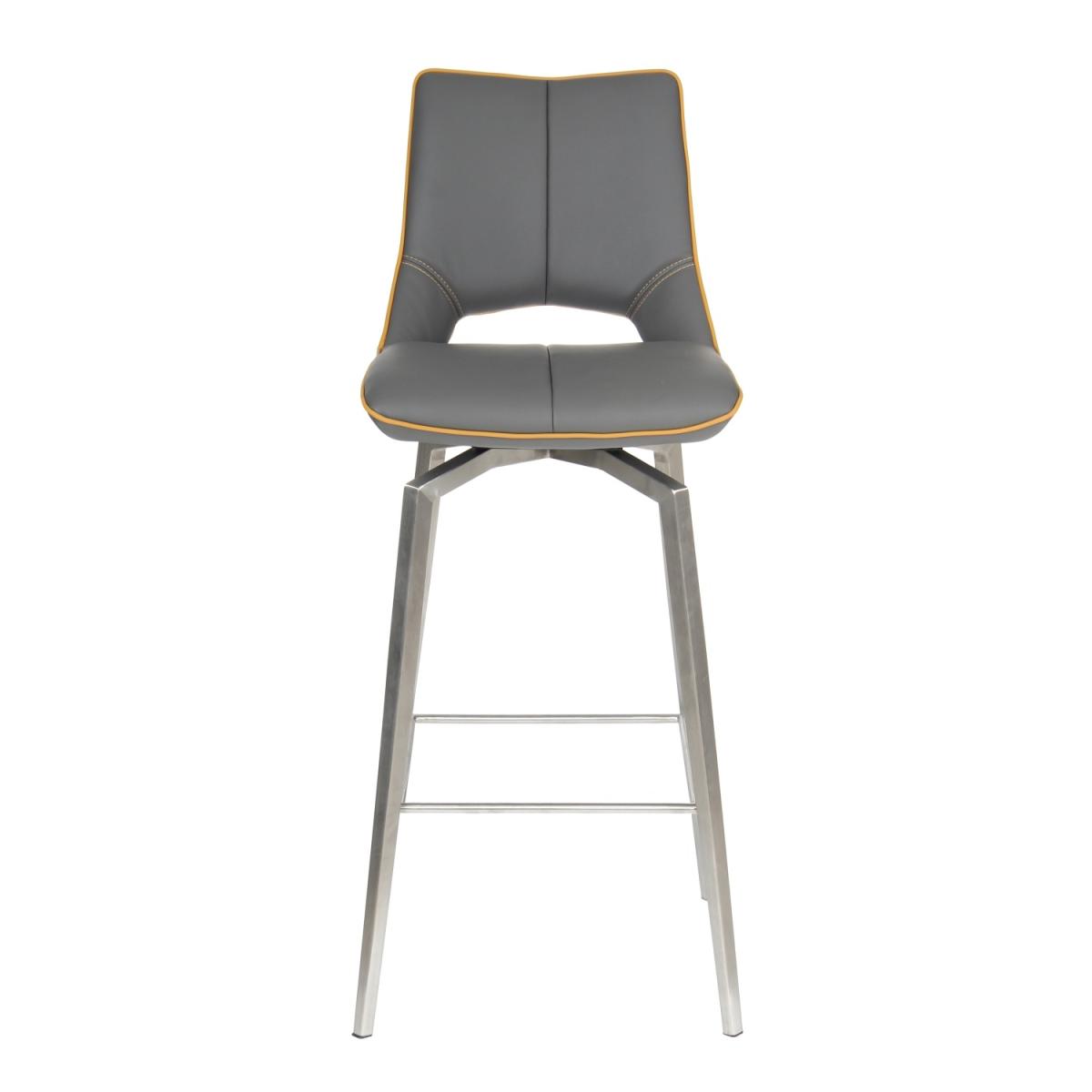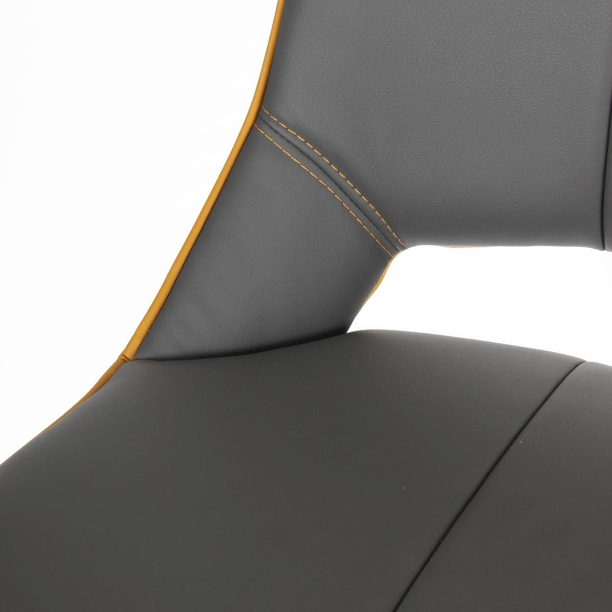 An ultra-modern angled bar chair, upholstered in graphite grey leather effect with contrasting yellow piping. The seat smoothly swivels before gently returning to a central position. Supplied with stainless steel tripod style legs. Assembly required. Sold individually.