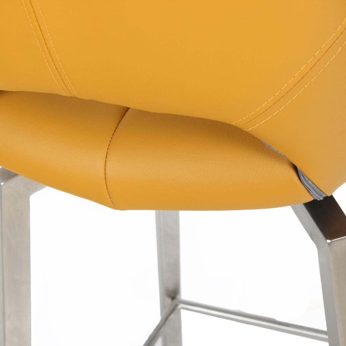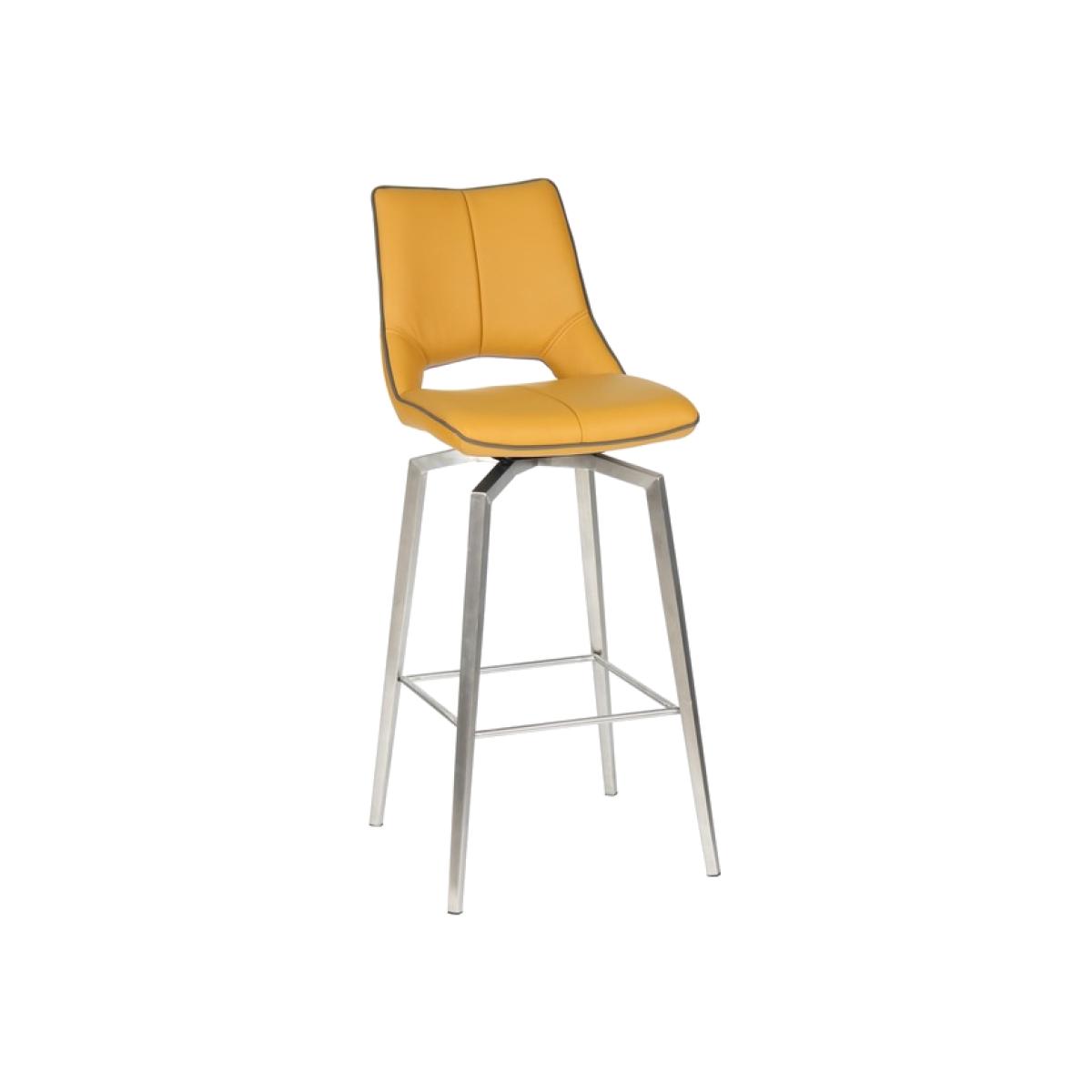 An ultra-modern angled bar chair, upholstered in yellow leather effect with contrasting grey piping. The seat smoothly swivels before gently returning to a central position. Supplied with stainless steel tripod style legs. Assembly required. Sold individually.
