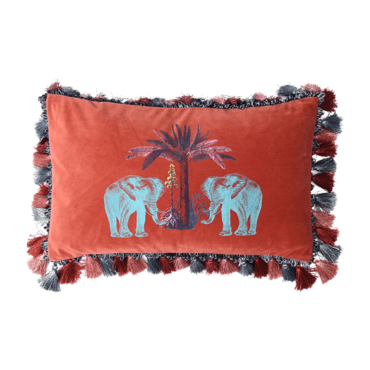 Velvet elephant print peach cushion with tassels The perfect accent pillow in the most delectable colours, the Malabar Coral cushion features a pair of burgundy elephants meeting under a palm tree. The deep-peach velvet cushion is framed by alternating tassels of plum and purple, reminiscent of vintage parasols. This versatile rectangular cushion adds a pop of colour and texture to brighten any living space, be it contemporary or classic. Composition: Velvet front and back, polyester fringes Screen printed front Includes feather pad Removable cover Discreet zip closure Colours may vary slightly due to batch printing Dry clean only