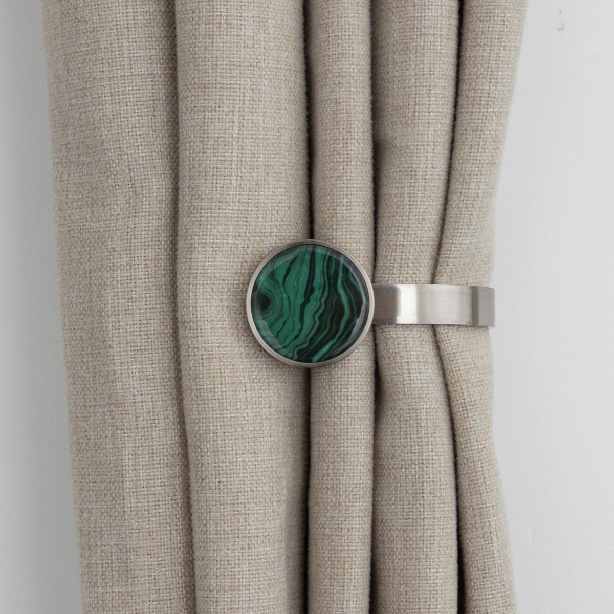 * Unique malachite design* Fittings included* Green and satin colourway* Matching Malachite finials available to purchase separately The unique malachite design, featuring a captivating blend of green and satin hues, adds a touch of opulence to your curtains. The set comes complete with included fittings for convenient installation, ensuring a seamless and polished look. Match these curtain holdbacks with the coordinating Malachite finials, available to purchase separately for a complete look.