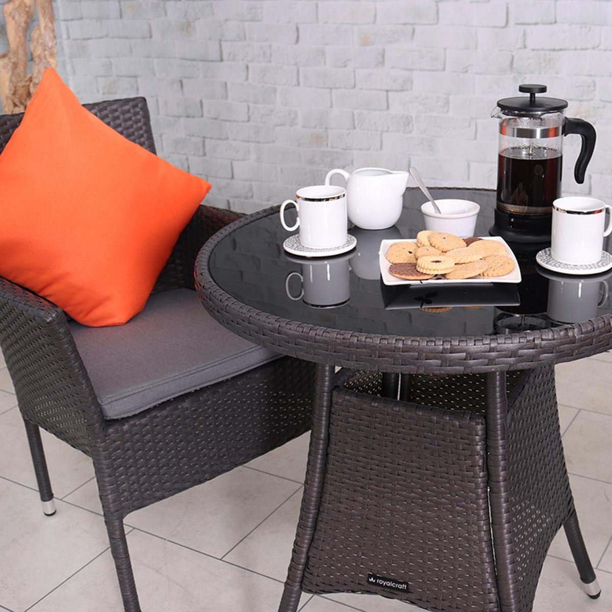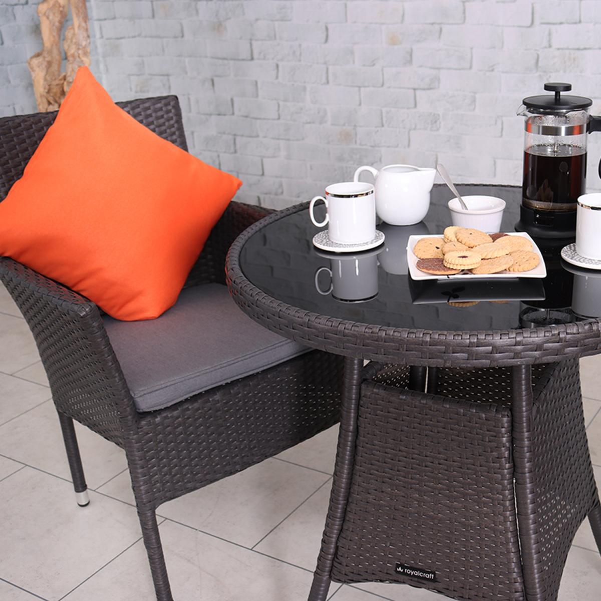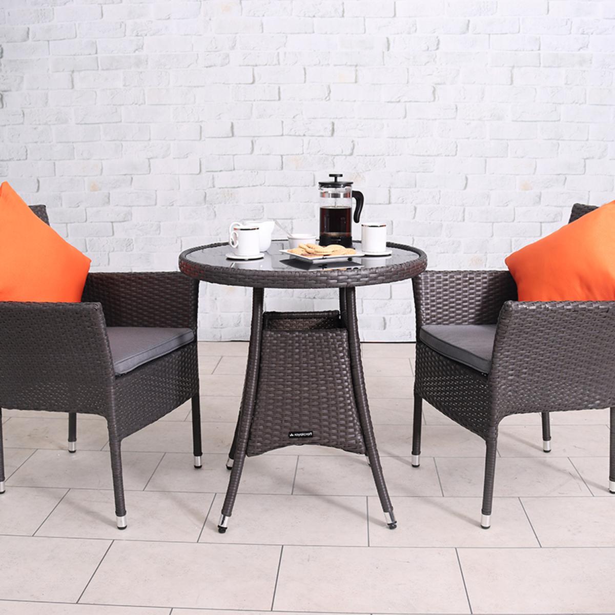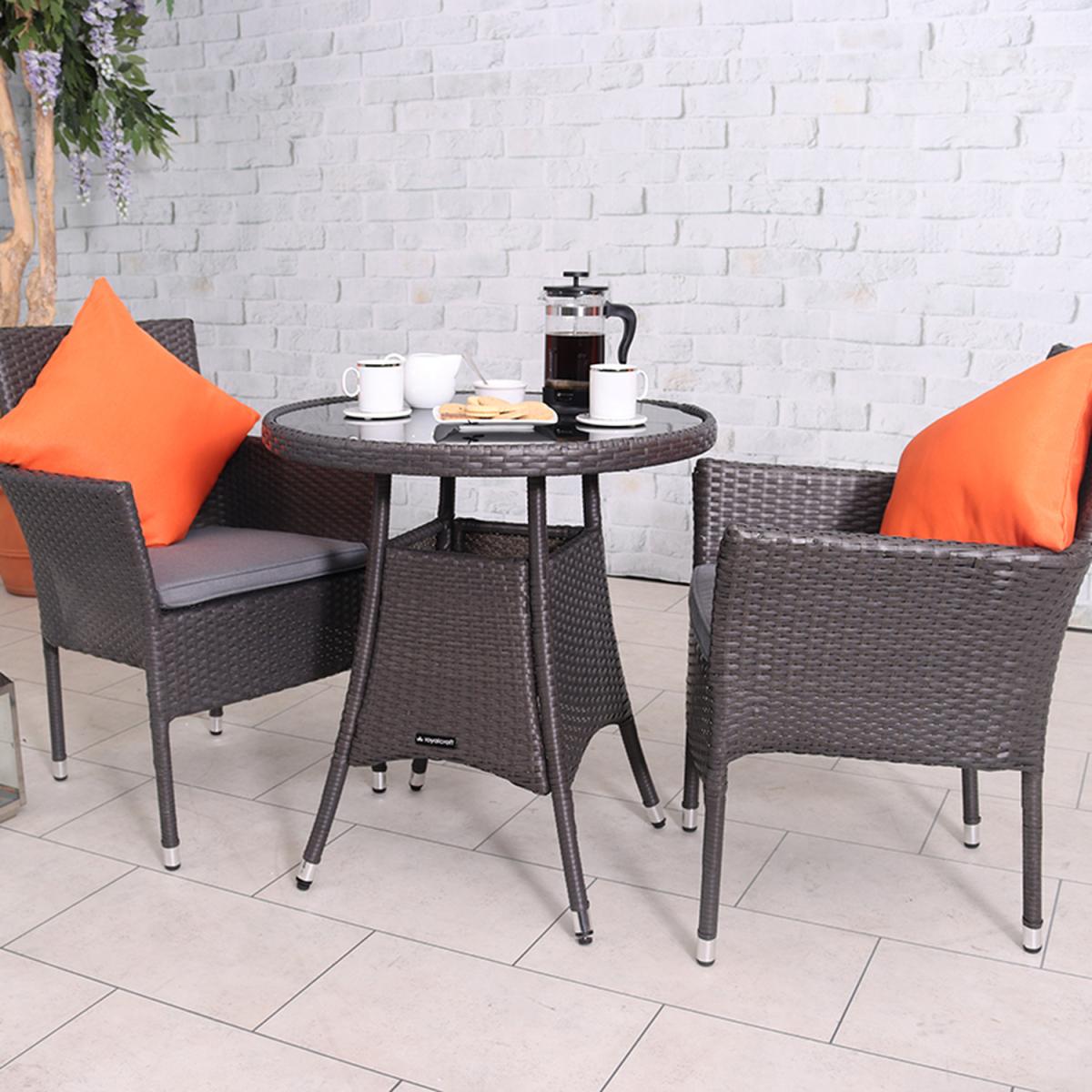 The Malaga 2 Seater Fixed Stacking Bistro Set collection is our budget friendly range. Made from a grey flat synthetic rattan weave, it is hand woven onto sturdy steel frames. Consisting of a table that features black inlay glass and two fixed stacking chairs complete with Weather Shield seat cushions.