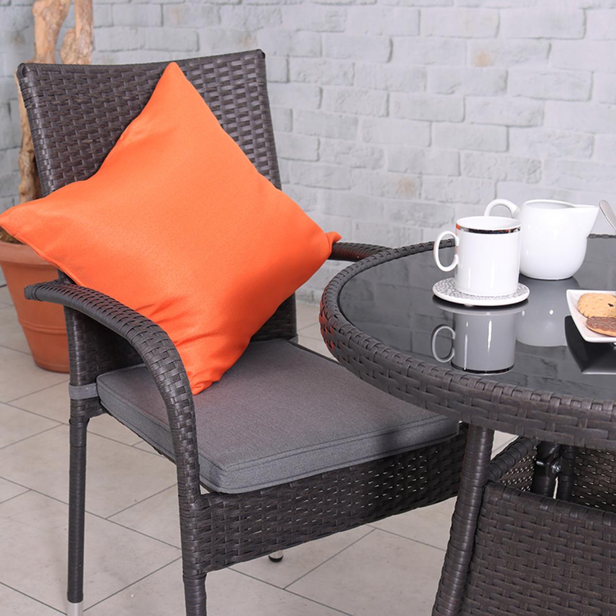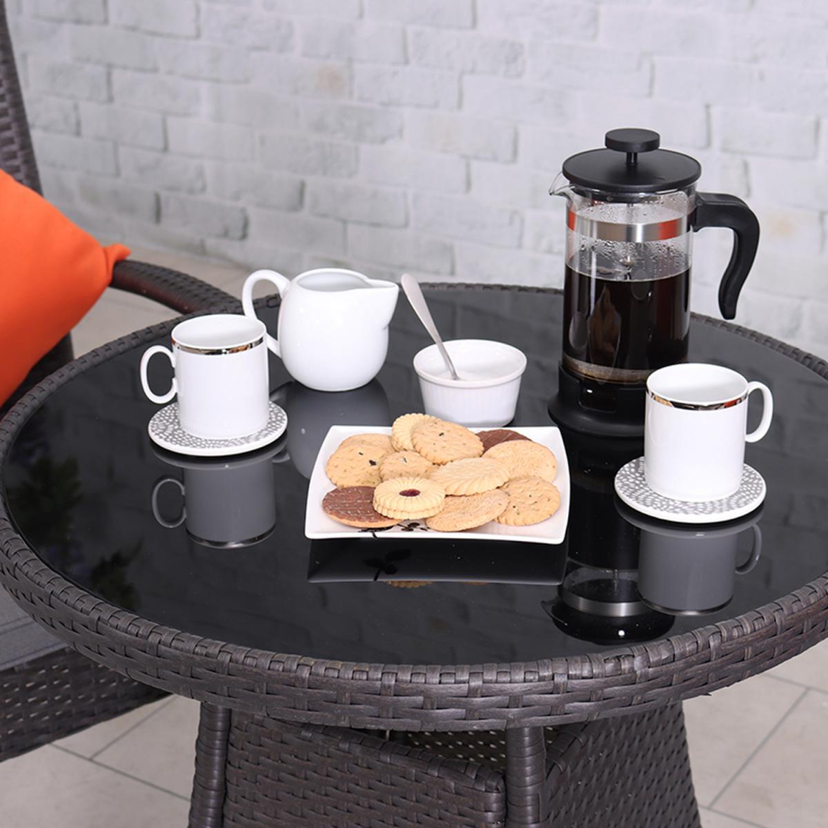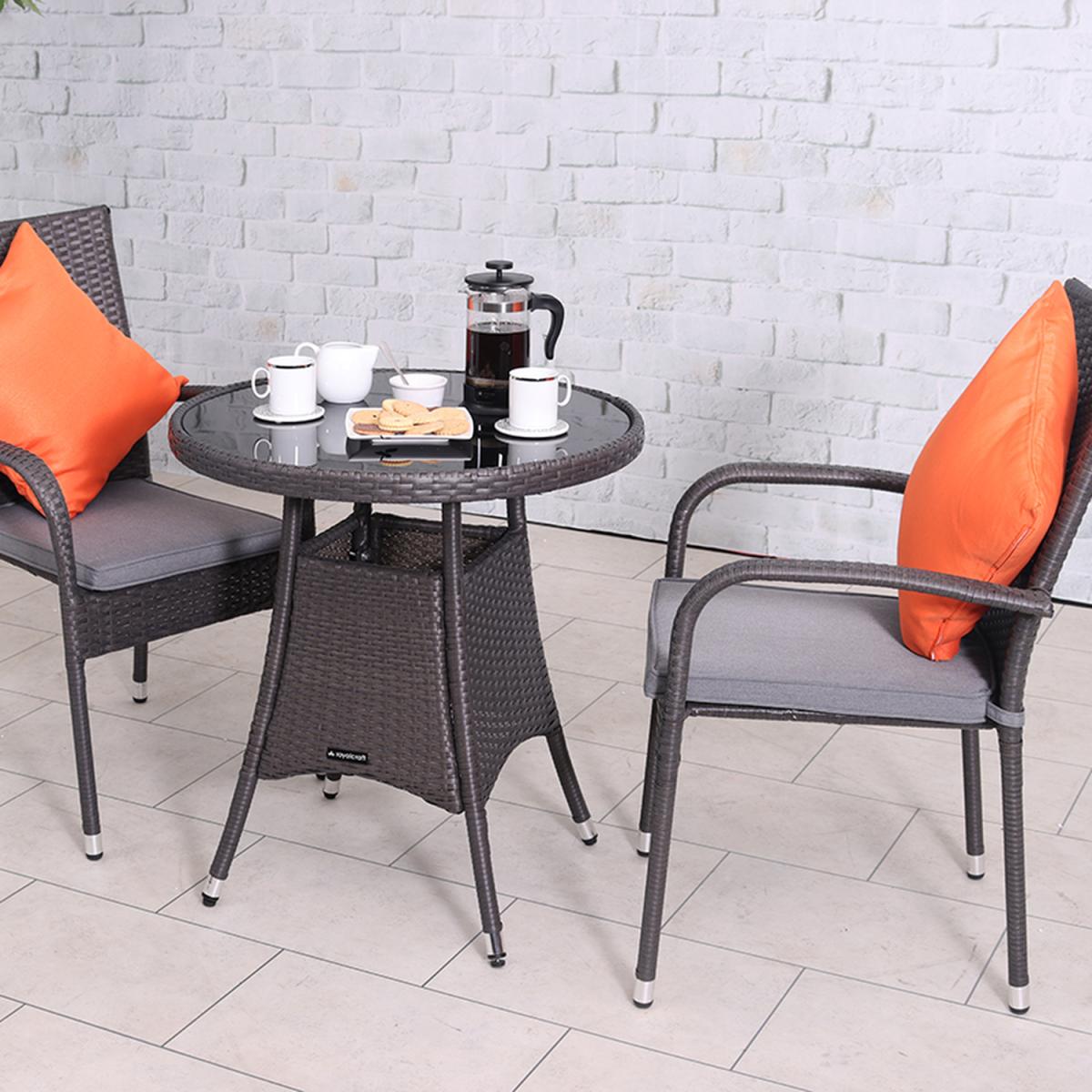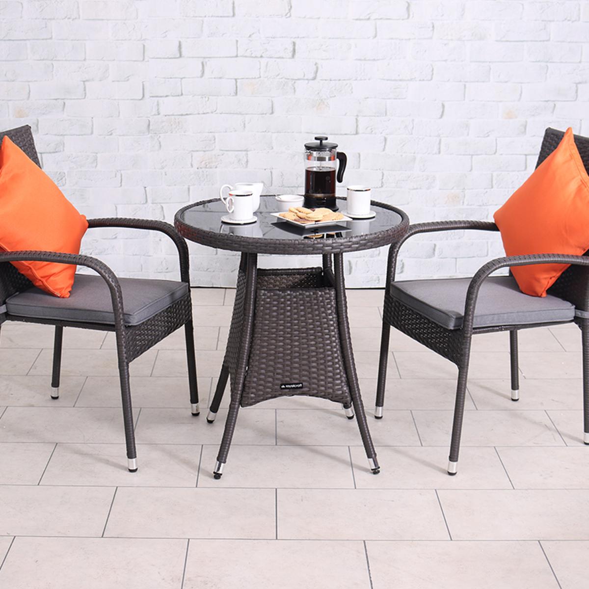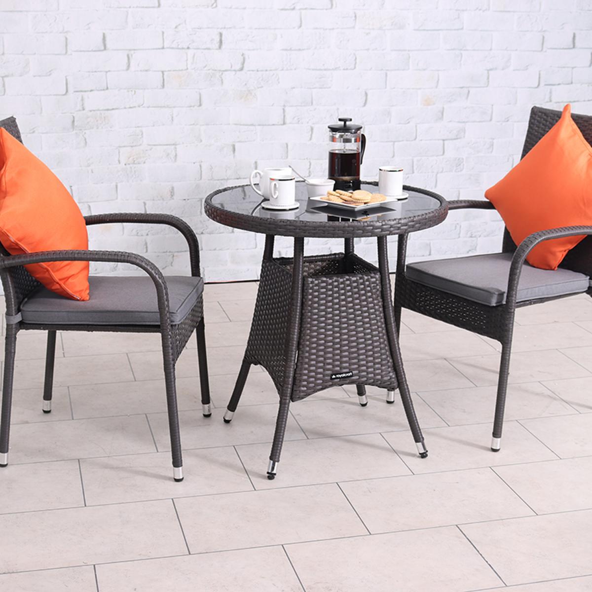 The Malaga 2 Seater Stacking Bistro Set collection is our budget friendly range. Made from a grey flat synthetic rattan weave, it is hand woven onto sturdy steel frames. Consisting of a table that features black inlay glass and two stacking chairs complete with Weather Shield seat cushions. It is the perfect set to store away easily.