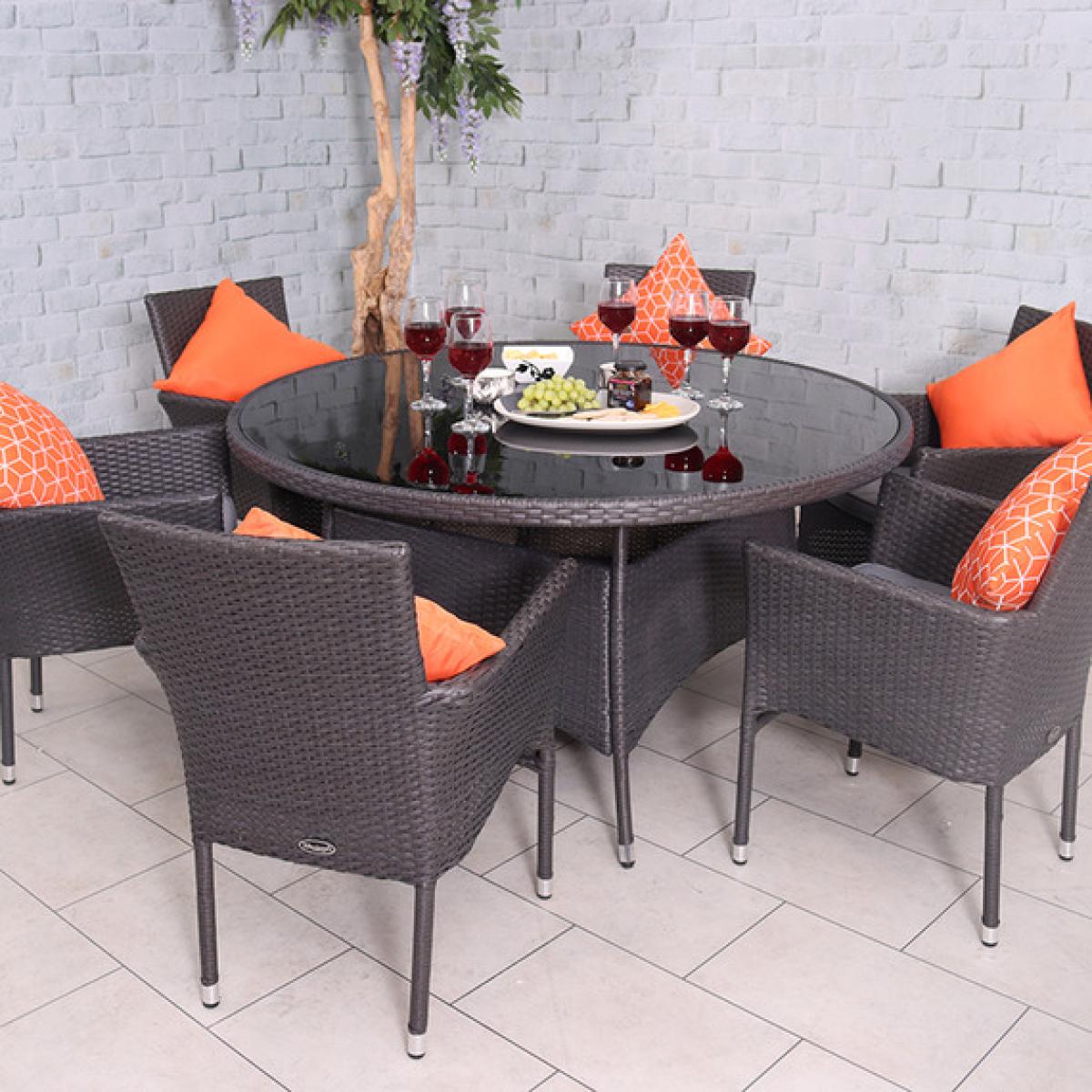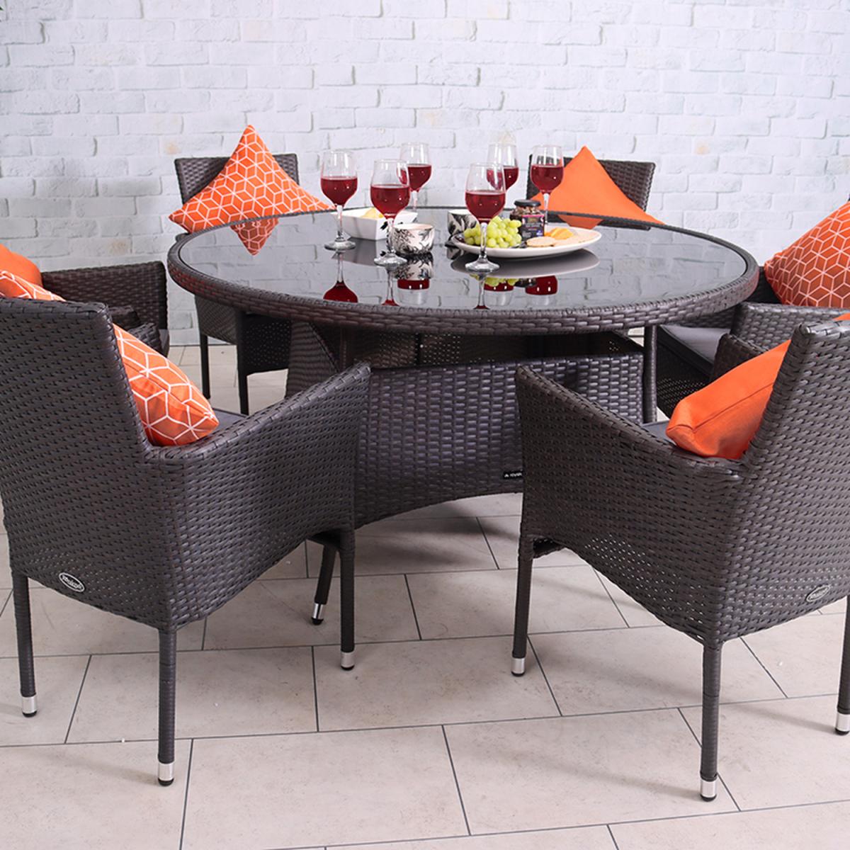 The Malaga 6 Seater Fixed Dining Set is made from a grey flat synthetic rattan weave, it is hand woven onto sturdy steel frames. Consisting of a table that features black inlay glass and six stacking chairs complete with Weather Shield seat cushions.