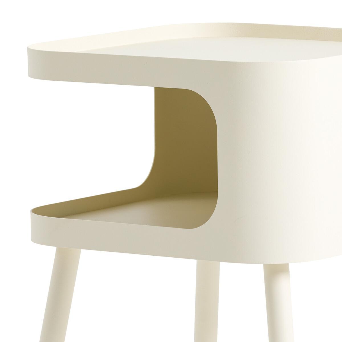The Malakou bedside table. A bedside table with a storage compartment and tabletop with a small rim. Product Details: - In metal with an epoxy finish. - 1 compartment - Adjustable legs - Sold with legs for self-assembly. Dimensions:: - L35 x H50 x D35cm Dimensions and weight of package: - L41 x H27.5 x D41cm, 7.2kg