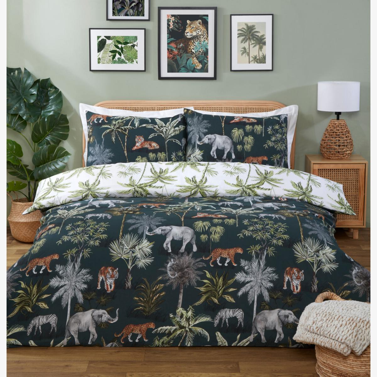 Transform your bedroom into a rich and colourful jungle with this Malawi Duvet Cover and Pillowcase Set. Stylish, artistic and undoubtedly luxurious, this bedding set is a great way to update your room. Available in different sizes, you're sure to find the right one for your home. With a palm tree print on the other side, you can enjoy two bedding sets in one!