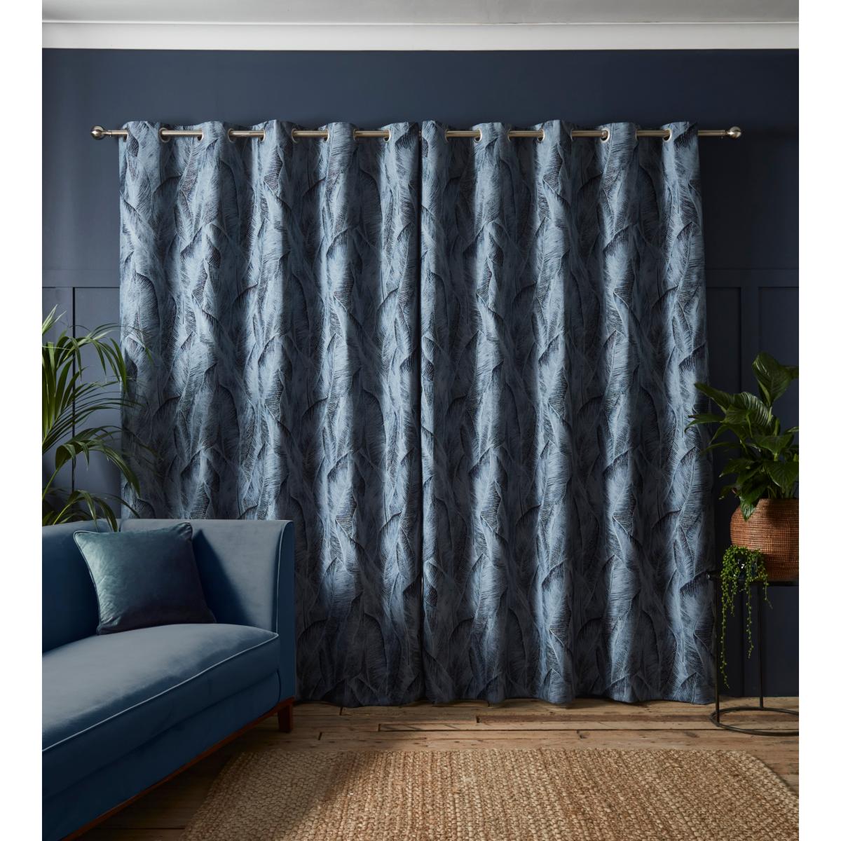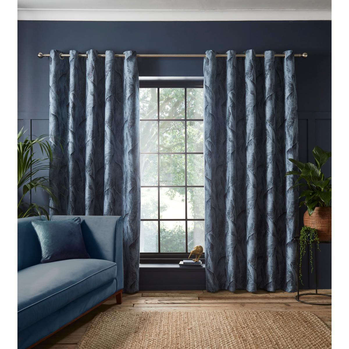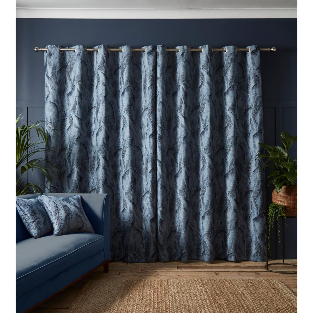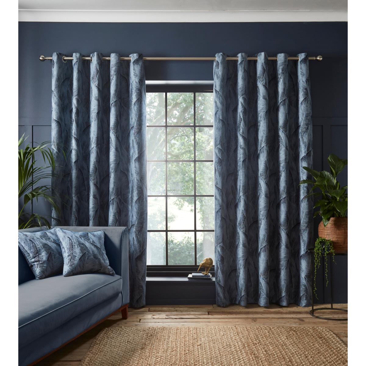 Add a personal touch to your home with our Malawi Eyelet curtains that boast a modern leaf design in a contemporary blue colourway. Complete with an easy to hang eyelet header, these curtains are made with a luxurious woven fabric. Each curtain panel has a 100% polyester lining which helps prevent the face fabric design from fading. Available in a selection of multiple widths and drops, there is also a coordinating cushion available. Disclaimer: Pattern matching can not be guaranteed across multiple pairs of curtains.