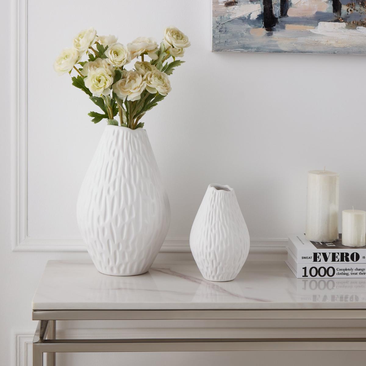 I love this large ceramic vase for its clean lines and textured surface, making it a versatile piece for various interiors. It works particularly well in contemporary, Scandi, or minimalist spaces, adding a sculptural element without overwhelming the overall look. Practical styling tips include filling it with seasonal flowers or greenery to bring colour and life, or leaving it empty as a statement piece on a console or sideboard. Its sizeable presence also makes it perfect as a corner or floor-standing feature, anchoring a room without feeling bulky. Keep it simple by pairing with understated decor and allow the vase to stand out as a focal point in your scheme.