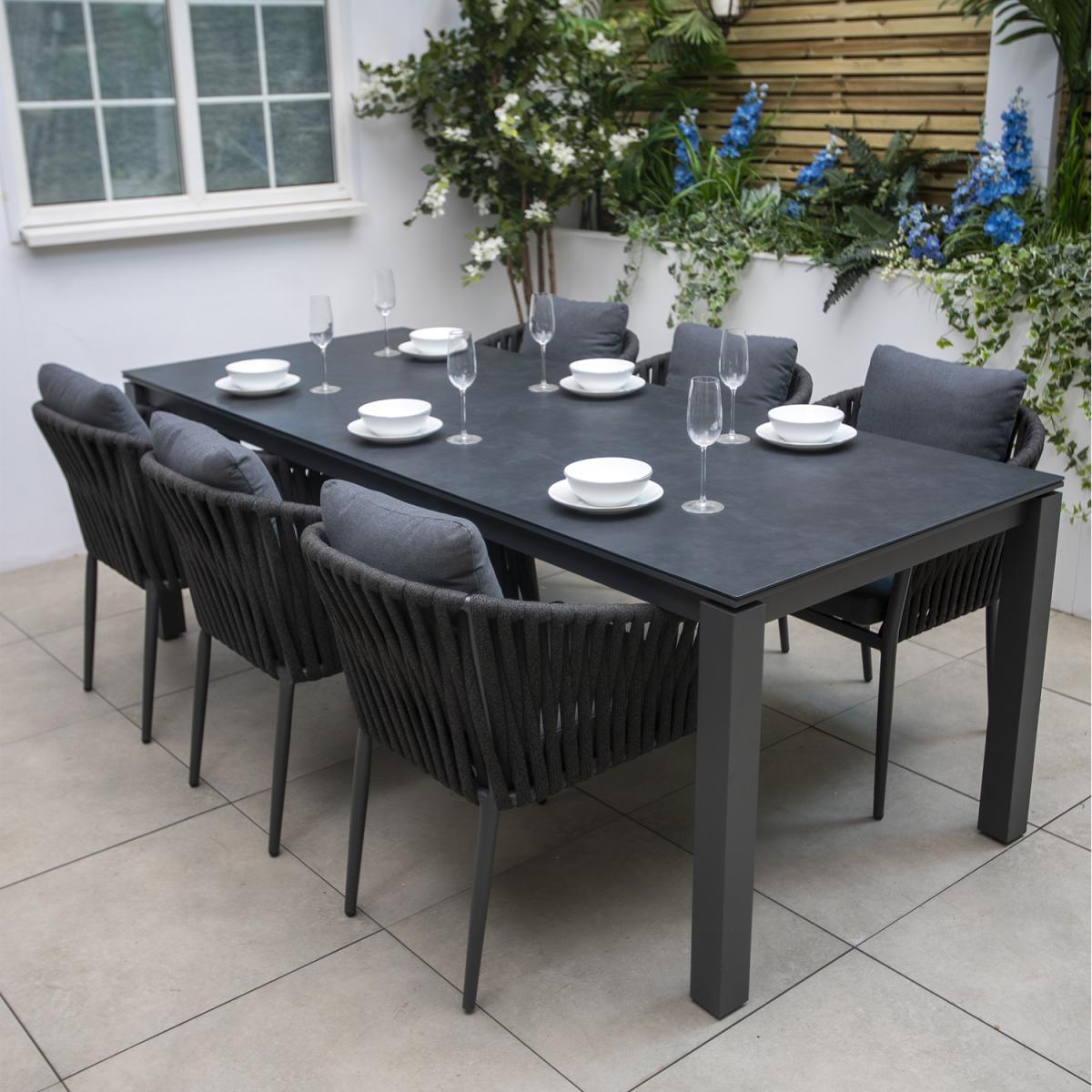 The Bracken Outdoors Maldives collection pairs a stylish design rope garden chair with a practical and durable aluminium table. Experience outdoor living in style with this stunning furniture set. The rope used for the chair is 3cm Charcoal Polyester with a rubber core ensuring the rope doesn't become saturated and allows for quick drying time. Both hardwearing and comfortable, the chairs come with 6cm deep cushions for your comfort and removable cushion covers are easy to clean. The rectangular table is made from lightweight aluminium which is powder coated in grey and a 6mm dark ceramic, glass look top for a classic, easy to clean look. Set Features 6 x Maldives Charcoal Rope Garden Chair Rectangular Powder Coated Grey Aluminium Table 6mm Dark Ceramic Glass Look Top Warranty - 3 Years Set Dimensions Chair - W 62cm, D 62cm, H78cm Table - L 220cm, D 90cm, H 76cm Recommended Footprint - 400cm x 300cm
