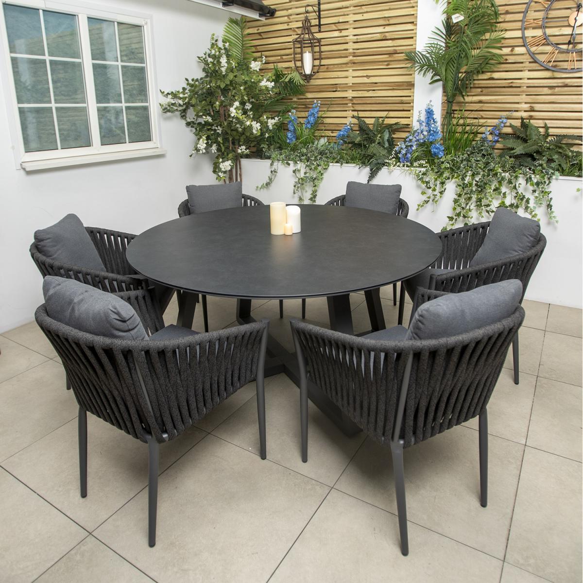 The Bracken Outdoors Maldives collection pairs a stylish design rope garden chair with a practical and durable aluminium table. The rope used for the chair is 3cm Charcoal Polyester with a rubber core ensuring the rope doesn't become saturated and allows for quick drying time. Both hardwearing and comfortable, the chairs come with 6cm deep cushions for your comfort and removable cushion covers are easy to clean. The round table is made from lightweight aluminium which is powder coated in grey and a 6mm dark ceramic, glass look top for a classic, easy to clean look. Set Features 6 x Maldives Charcoal Rope Garden Chair Round Powder Coated Grey Aluminium Table 6mm Dark Ceramic Glass Look Top Warranty - 3 Years Set Dimensions Chair - W 62cm, D 62cm, H78cm Table - Diameter 150cm, H 75cm Recommended Footprint - 350cm x 350cm