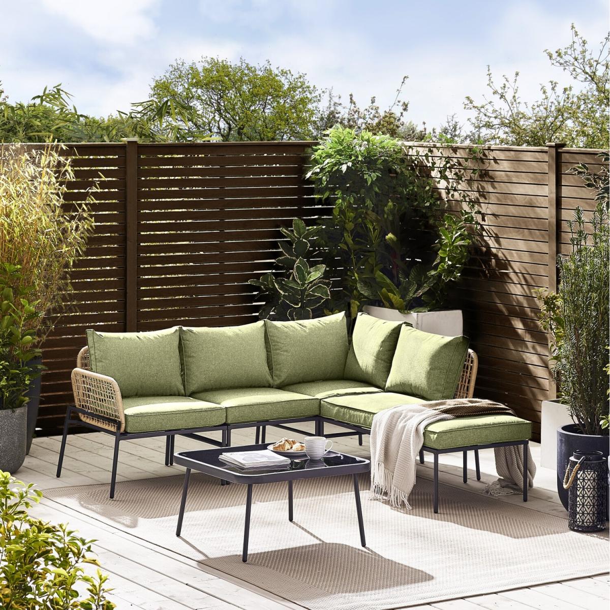 Our Maldives 5-seat black metal and rattan outdoor corner sofa with cushions will add some relaxed entertaining and relaxing space to your outdoor area, whether it's a patio, deck or even the conservatory. This is a gorgeous design that serves up boho laid-back vibes with the woven PE rattan and rope along with a splash of industrial Scandi flair through those black powder-coated tapered legs. The matching square glass-topped coffee table creates a focal point and the thick cushions allow you to relax in comfort. The glass table top is tempered glass which will be durable but keep the set feeling light and airy. The steel frame and table are UV and weather-resistant so shouldn't fade. The cushions are splashproof (so if any spills occur, pick up the cushion and give it a firm pat on the underside to encourage the droplets to roll off). However, the cushions should not be left outside or in damp conditions. Store them somewhere warm and dry. If they do get wet then allow them to fully dry in the sun or somewhere warm before you store them. This set includes a FREE water-resistant cover but please note, that this is not fully waterproof and you should still store your cushions somewhere dry during wet weather and through winter.