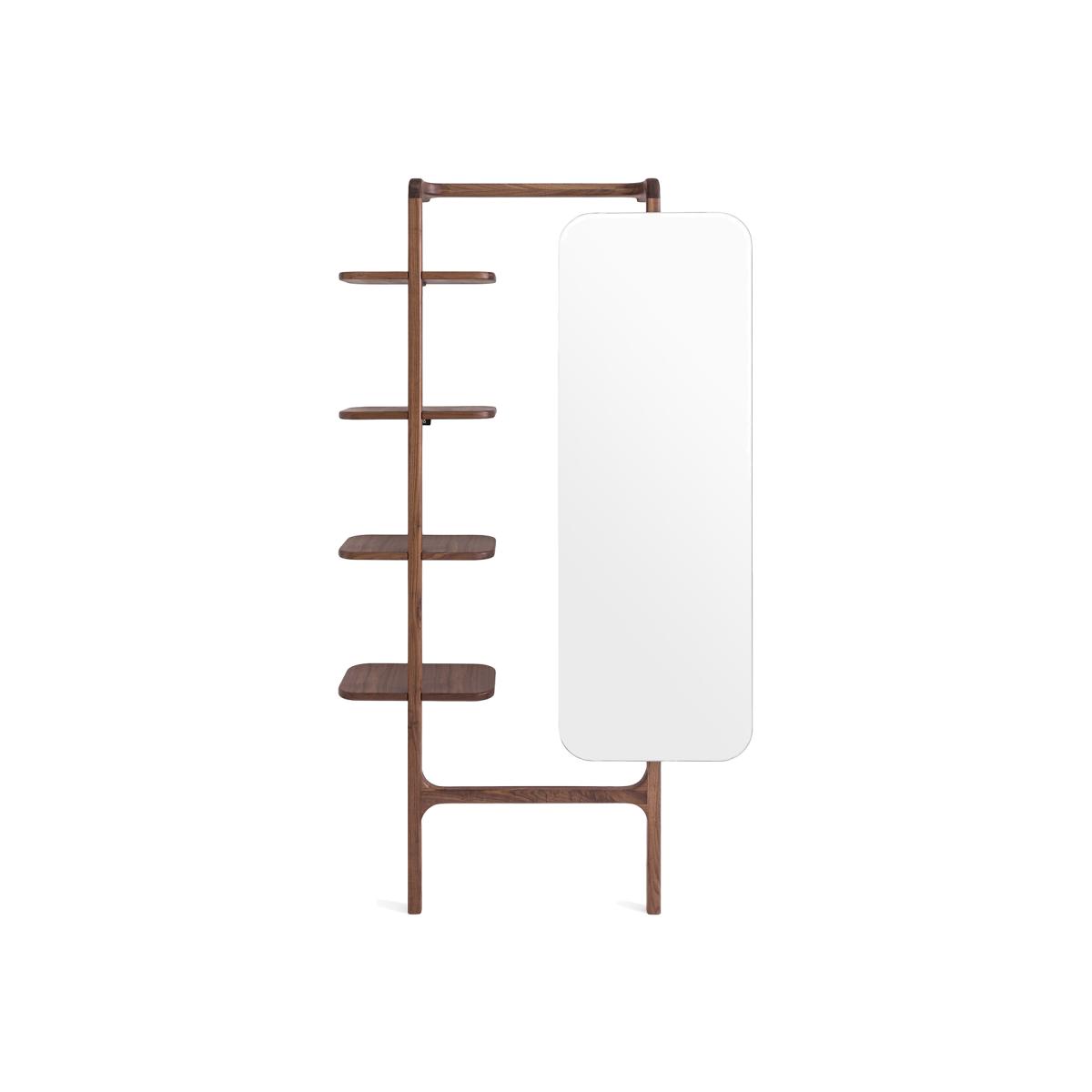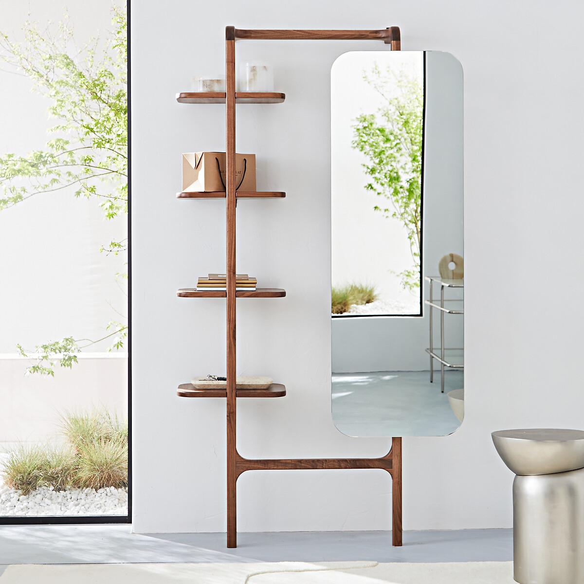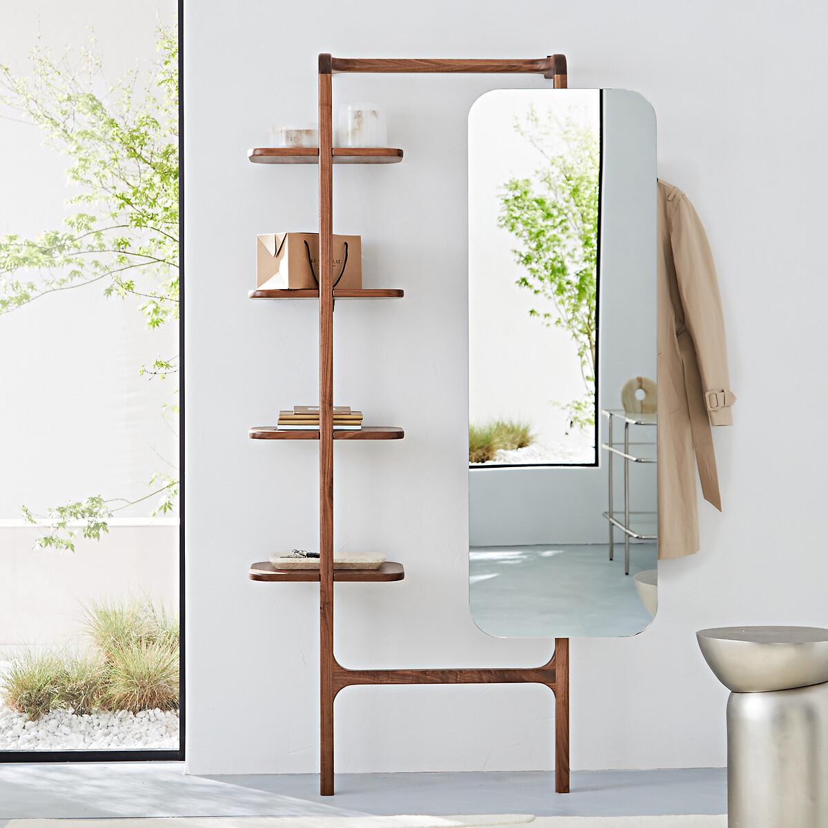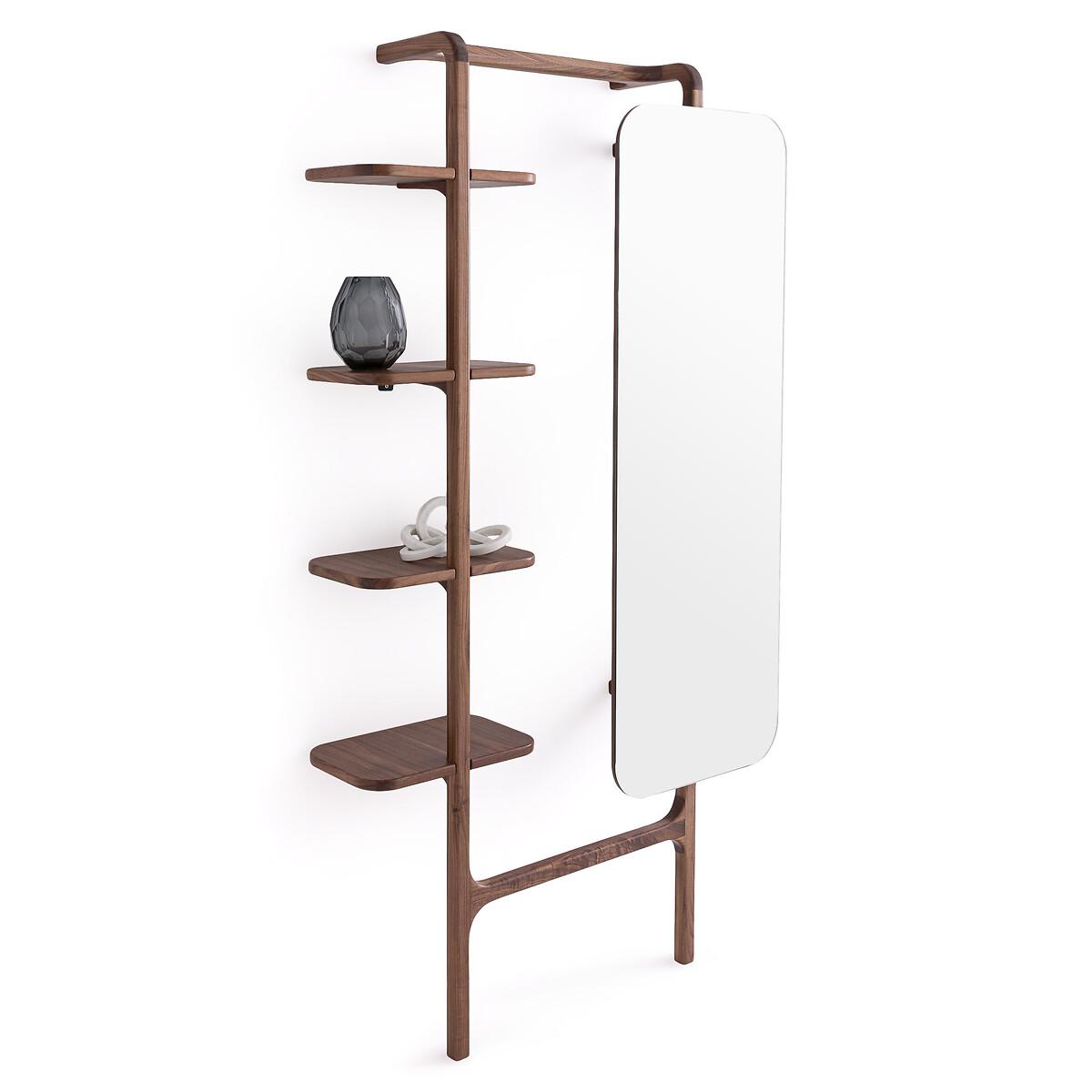 As elegant as it is functional, the Malea mirror locker room is the ideal storage combination. Multifunctional, it consists of four shelves with edges, a mirror with an organic outline and an integrated rail. Solid walnut structure, turned wood uprights, rectangular shelves with rounded corners... with its chic and sophisticated design, Malea can be installed in the bedroom, an entranceway or can complete a dressing room. An AMPM creation. Product Details • Solid walnut • Wall mounting (screws, dowels and brackets provided)Dimensions. Overall • Width: 104cm • Height: 189cm • Depth: 25cm. Mirror • L48 x H139cm. Shelf • L40 x D25 x thickness 2cm • Assembly required. Dimensions and weight of parcel • 1 parcel • L111 x H181 x D32cm. 25kg
