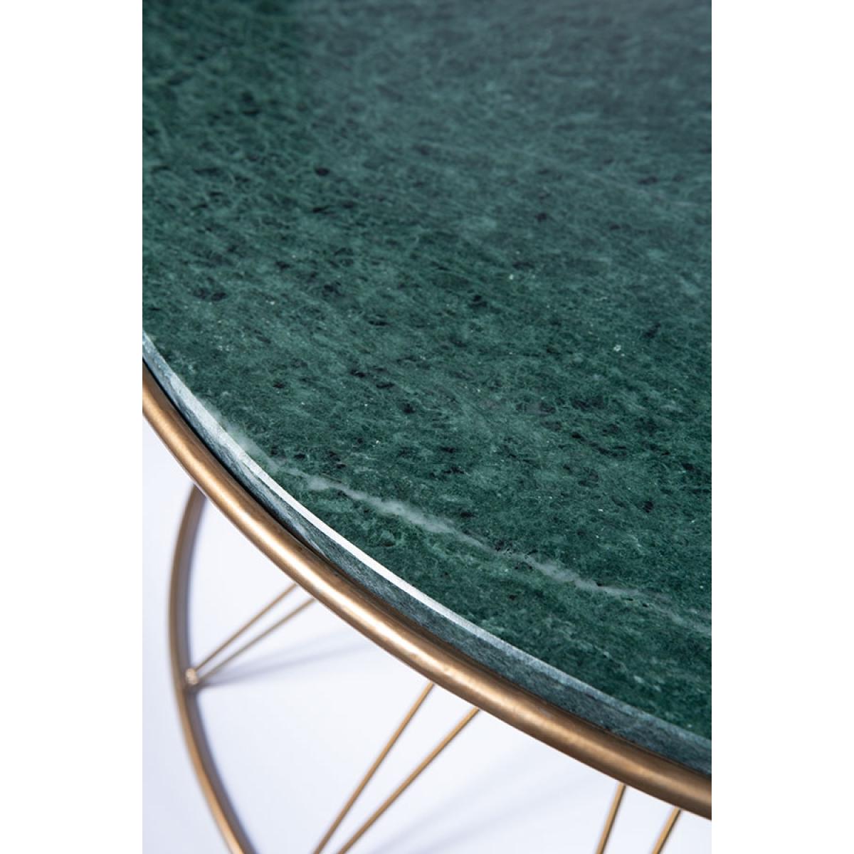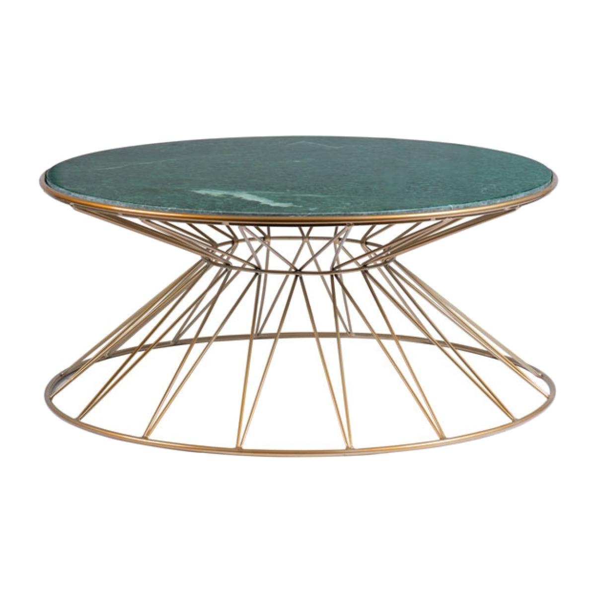 A contemporary coffee table with an intricate ‘woven’ frame. Form Inspired by traditional Malinese Djembe hand drums. Brass paint finish. Solid marble top. Partial assembly required, simply place the top on. Due to its natural formation every piece of marble is unique. There may be subtle differences in colour, tone and composition from the image shown. On occasions fissures may be present, these are natural characteristics and do not compromise the marble’s structural integrity. Wipe with a soft, dry cloth. Avoid using chemical based cleaners as these could damage the finish.