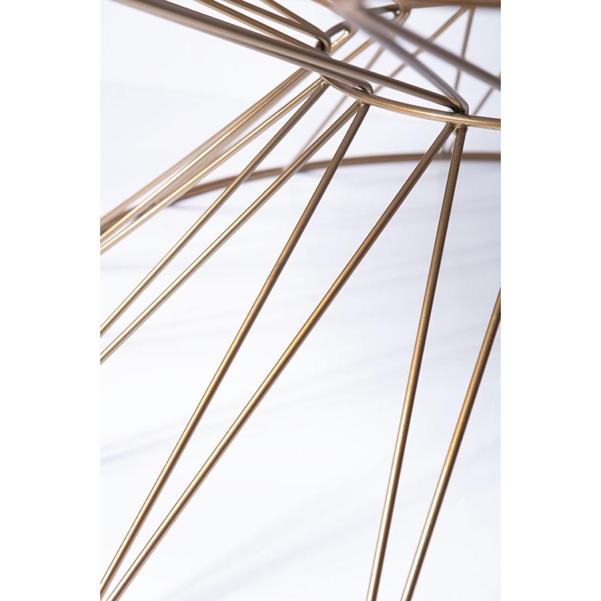 A contemporary coffee table with an intricate ‘woven’ frame. Form Inspired by traditional Malinese Djembe hand drums. Brass paint finish. Solid marble top. Partial assembly required, simply place the top on. Due to its natural formation every piece of marble is unique. There may be subtle differences in colour, tone and composition from the image shown. On occasions fissures may be present, these are natural characteristics and do not compromise the marble’s structural integrity. Wipe with a soft, dry cloth. Avoid using chemical based cleaners as these could damage the finish.