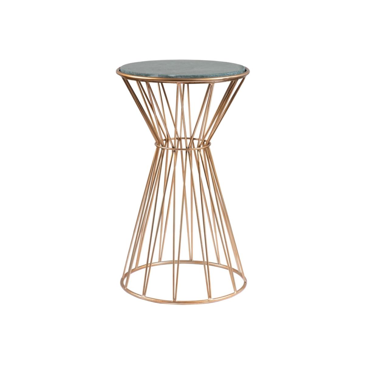 A contemporary side table with an intricate ‘woven’ frame. Form Inspired by traditional Malinese Djembe hand drums. Brass paint finish. Solid marble top. Partial assembly required, simply place the top on. Due to its natural formation every piece of marble is unique. There may be subtle differences in colour, tone and composition from the image shown. On occasions fissures may be present, these are natural characteristics and do not compromise the marble’s structural integrity. Wipe with a soft, dry cloth. Avoid using chemical based cleaners as these could damage the finish.