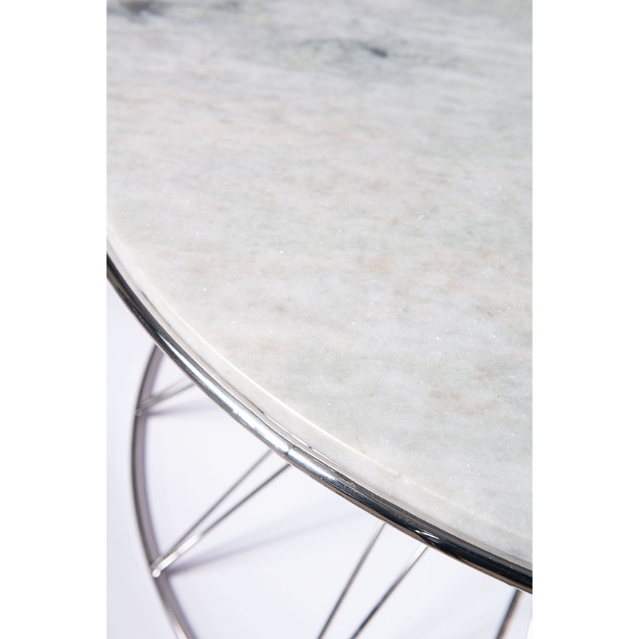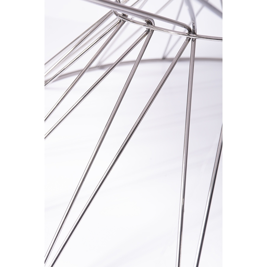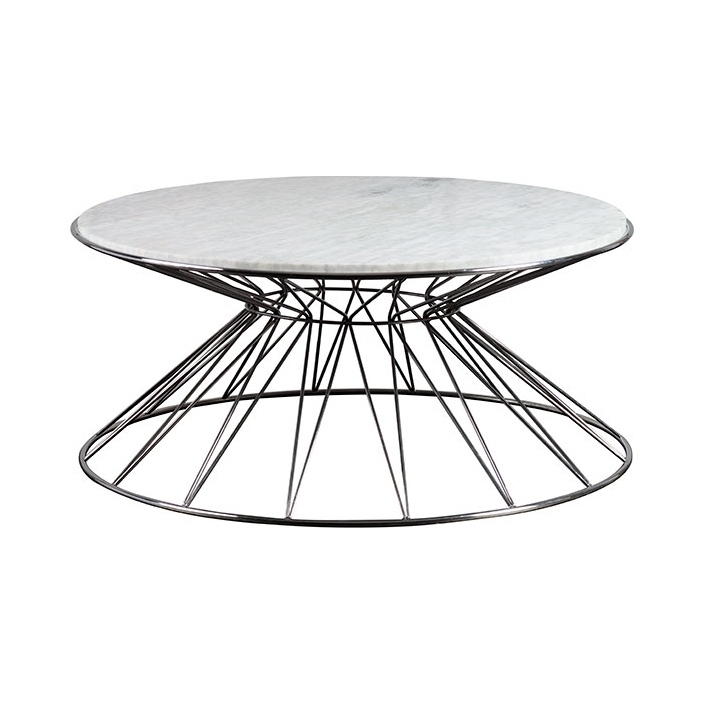 A contemporary coffee table with an intricate ‘woven’ frame. Form Inspired by traditional Malinese Djembe hand drums. Chrome electro plated steel finish. Solid marble top. Partial assembly required, simply place the top on. Due to its natural formation every piece of marble is unique. There may be subtle differences in colour, tone and composition from the image shown. On occasions fissures may be present, these are natural characteristics and do not compromise the marble’s structural integrity. Wipe with a soft, dry cloth. Avoid using chemical based cleaners as these could damage the finish.