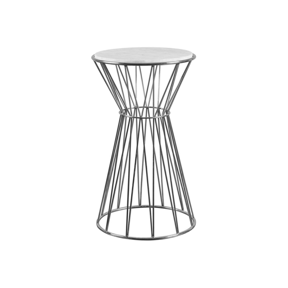 A contemporary side table with an intricate ‘woven’ frame. Form Inspired by traditional Malinese Djembe hand drums. Chrome electro plated steel finish. Solid marble top. Partial assembly required, simply place the top on. Due to its natural formation every piece of marble is unique. There may be subtle differences in colour, tone and composition from the image shown. On occasions fissures may be present, these are natural characteristics and do not compromise the marble’s structural integrity. Wipe with a soft, dry cloth. Avoid using chemical based cleaners as these could damage the finish.