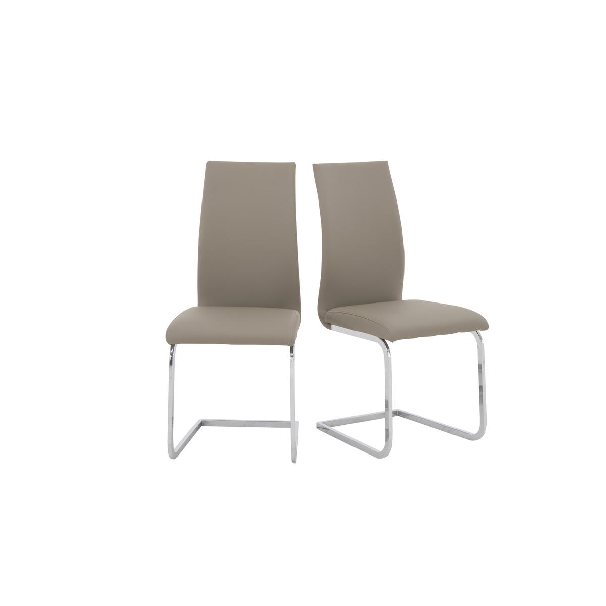 Sleek, modern dining chair with cantilever style legs. Cushioned seat and back upholstered in faux leather. Chair back has a gentle, supportive curve. In a choice of 4 colours – black, white, taupe or cream. Stainless steel frame has a polished chrome finish. Faux leather is hard wearing and easy to care for. Practical for everyday dining, stylish for entertaining