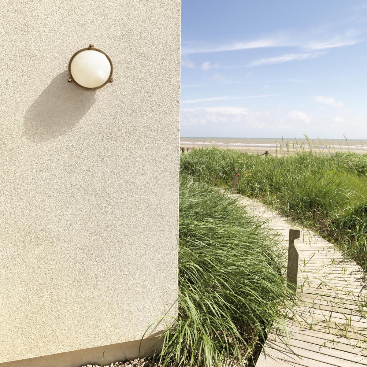 A 30s feel for this wall / ceiling light with its retro charm. Malibu’s silhouette is reminiscent of boat lights or the headlights of vintage cars. Malibu consists of a solid brass frame which holds a convex optical glass lens for high-quality lighting. This textured glass is covered with raised prisms which improve the optical properties of the glass (refraction, dispersion, efficiency etc). The lighting is optimal: diffused, functional and not dazzling. The Malibu wall / ceiling light adds character to your exteriors and effectively illuminates an entrance, porch or terrace. It can also be used in a bathroom (zone 1, 2 and 3). This solid brass wall light is designed to withstand all the vagaries of the weather: it’s suitable for the most exposed areas and benefits from exceptional durability. The brass will acquire a natural patina over time. The English brand Astro Lighting is popular among the hotel industry for the quality and performance of its lights, which fit just as well into both public and private environments. All Astro Lighting lamps are made in the UK. Created to provide maximum lifespan, each Astro product is manufactured with rigour and total attention, every step of the way, to ensure it will stand the test of time. Simplicity is at the heart of the design: the products are refined in order to better reveal their fundamental values.