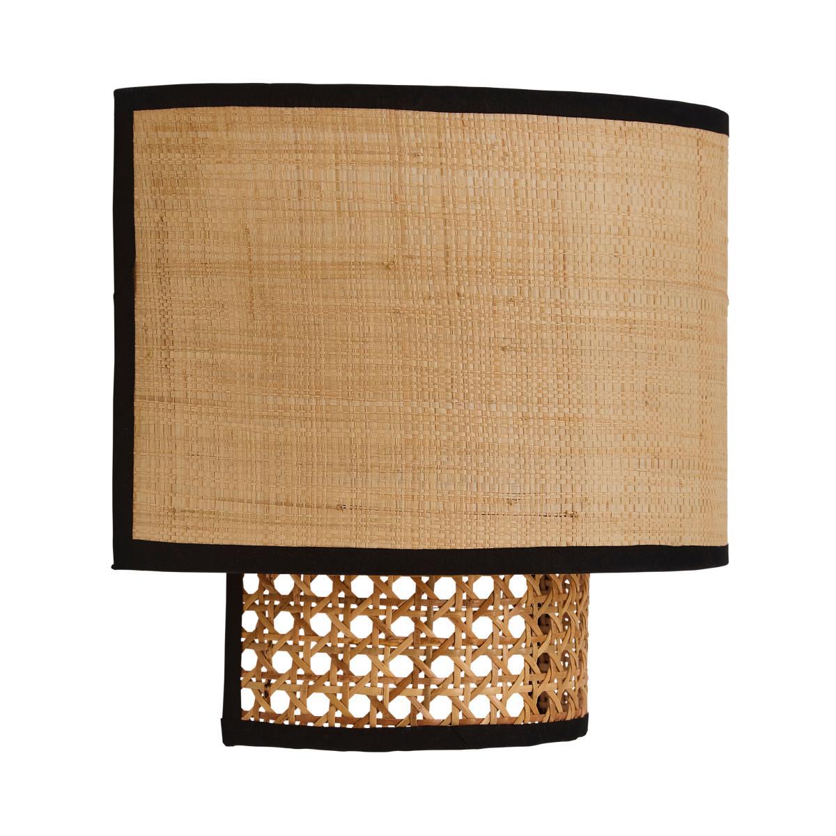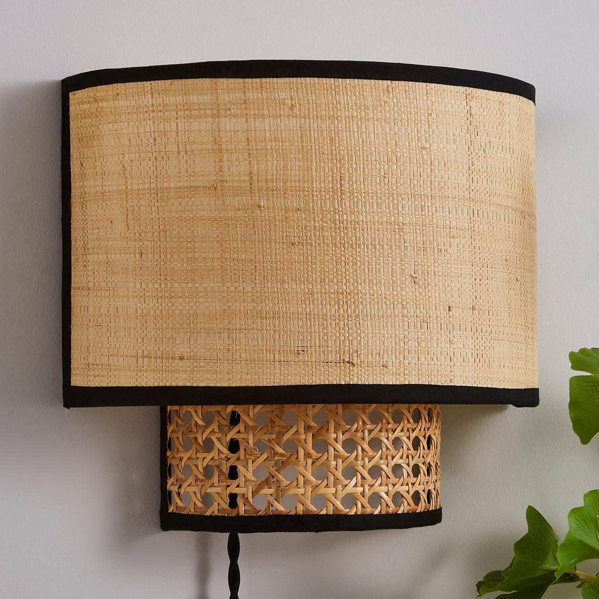 Crafted with a stunning curved design, the Malika Cane Easy Fit Plug-In Wall Light features a natural coloured shade weaved in raffia and cane material and a black trim for a detailed finish, complete with a metal base and black twisted fabric cable to complete the look. A perfect wall light for any modern and traditional home.