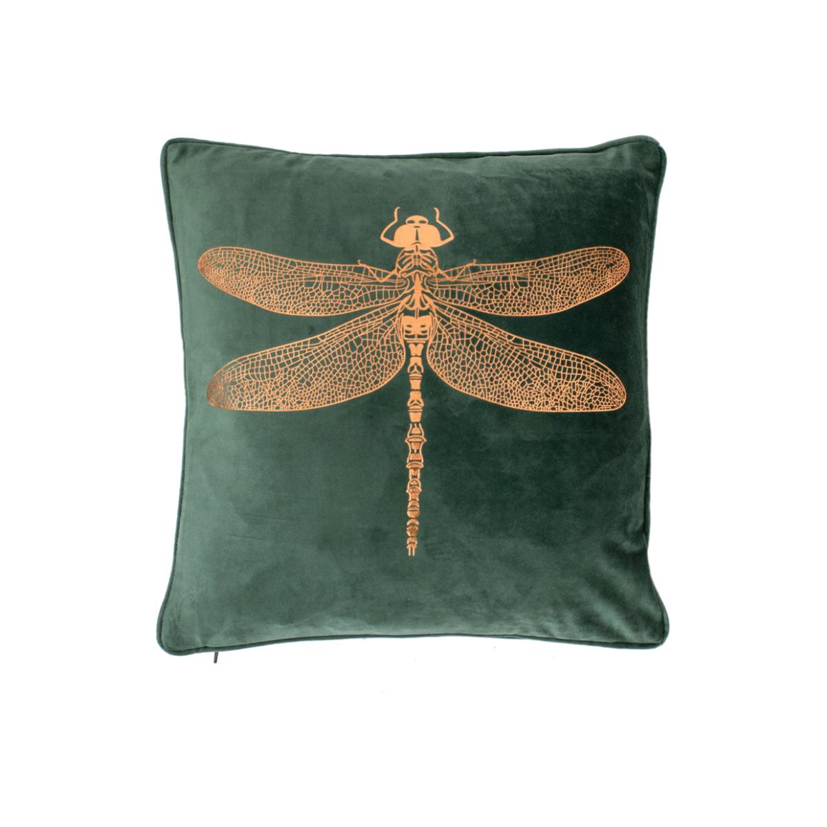 Discover the unexpected glamour of the Malini Dennis cushion in green. This plush cushion showcases a statement dragonfly motif that stands out against the rich green fabric in a shimmering metallic copper tone. Perfect for adding a stylish focal point to your living area or bedroom, why not combine this dramatic piece with other cushions in complementary tones for a delightful eclectic effect? Generously proportioned, this sophisticated 43cm x 43cm cushion offers plenty of comfortable support to enable you to relax in style. It will look superb with a range of decorative styles, from elegantly opulent looks to quirky maximalist interiors.
