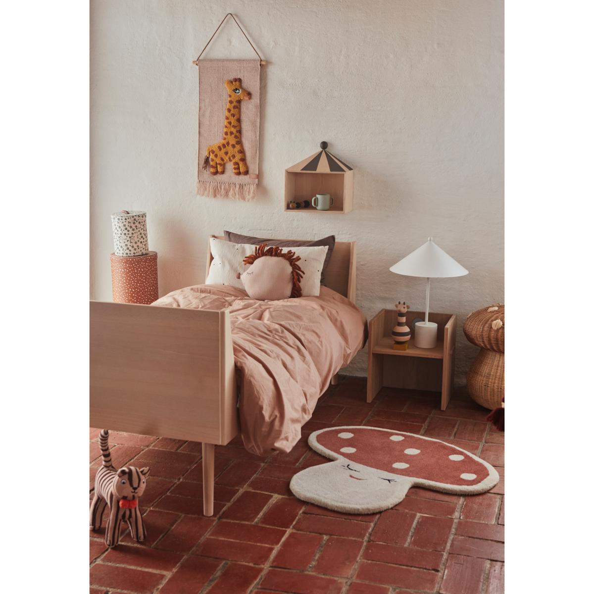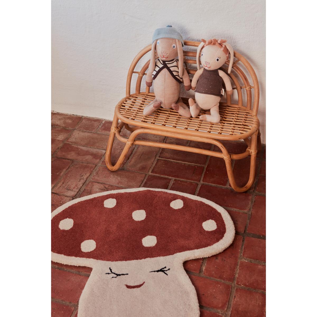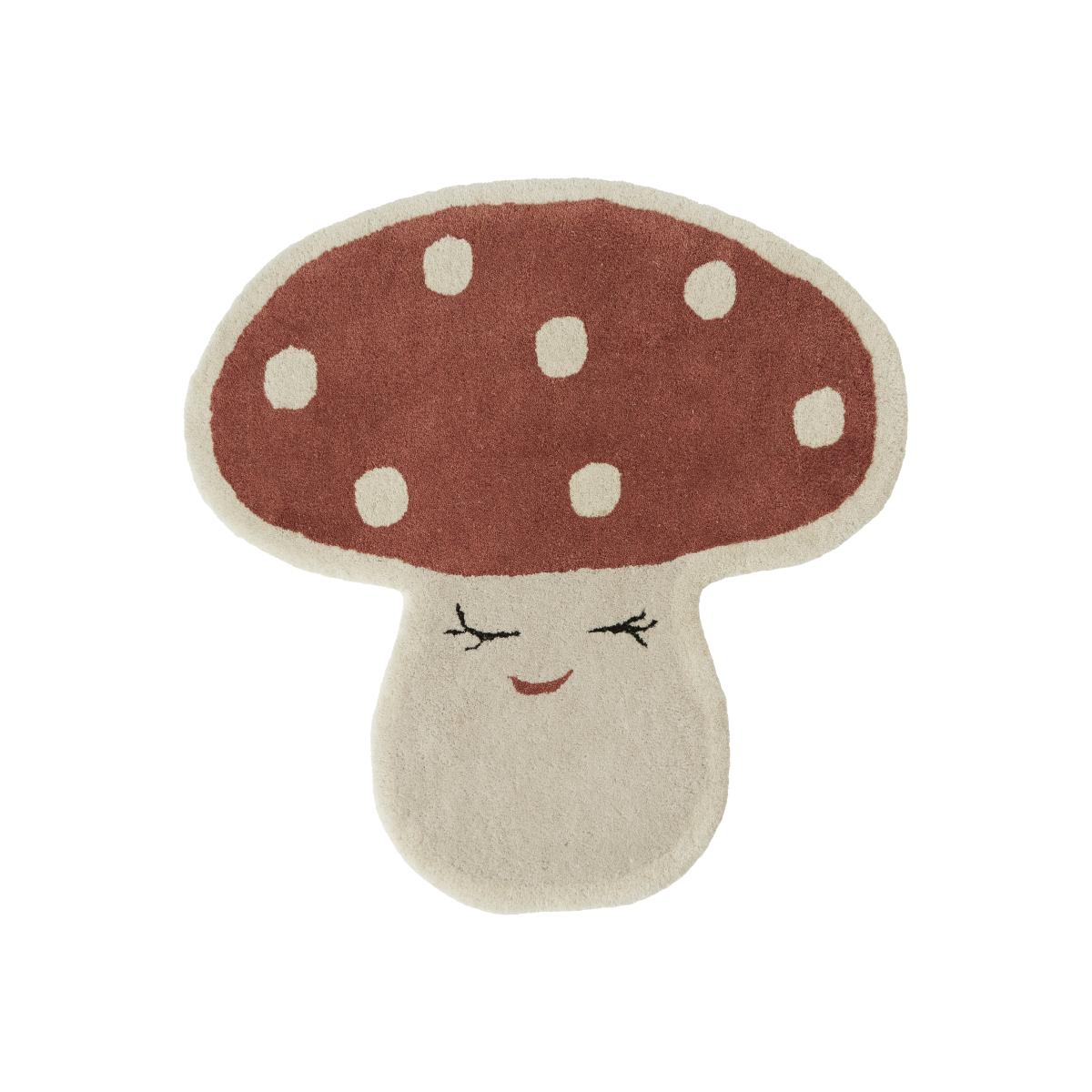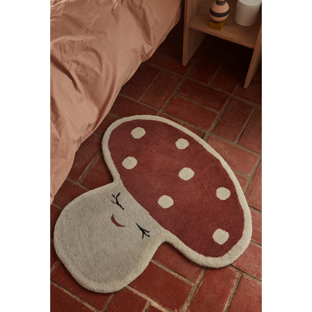 Malle mushroom mat 75x77 cm from OYOY looks like a mushroom with a little face and is made of a sustainable mixture of wool and cotton. The rug has a rugged finish and is very comfortable. Perfect as a decorative element or a play-mat in a child's room.
