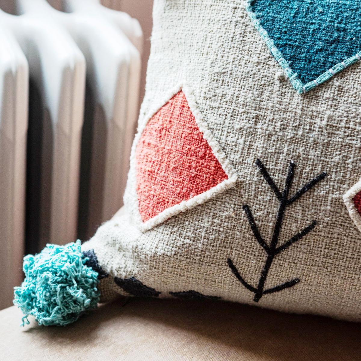 I love this cushion for its bold tribal pattern and playful pops of colour, which add visual interest without overwhelming a space. It works particularly well in boho or eclectic interiors, where mix-and-match textiles are encouraged, but it can also bring a touch of global charm to more neutral schemes. Practical styling tips include pairing it with other textured cushions for a layered look or placing it on a neutral sofa to let the pattern stand out. Its size and design make it a great statement piece that balances well in both relaxed sittings and more curated settings.