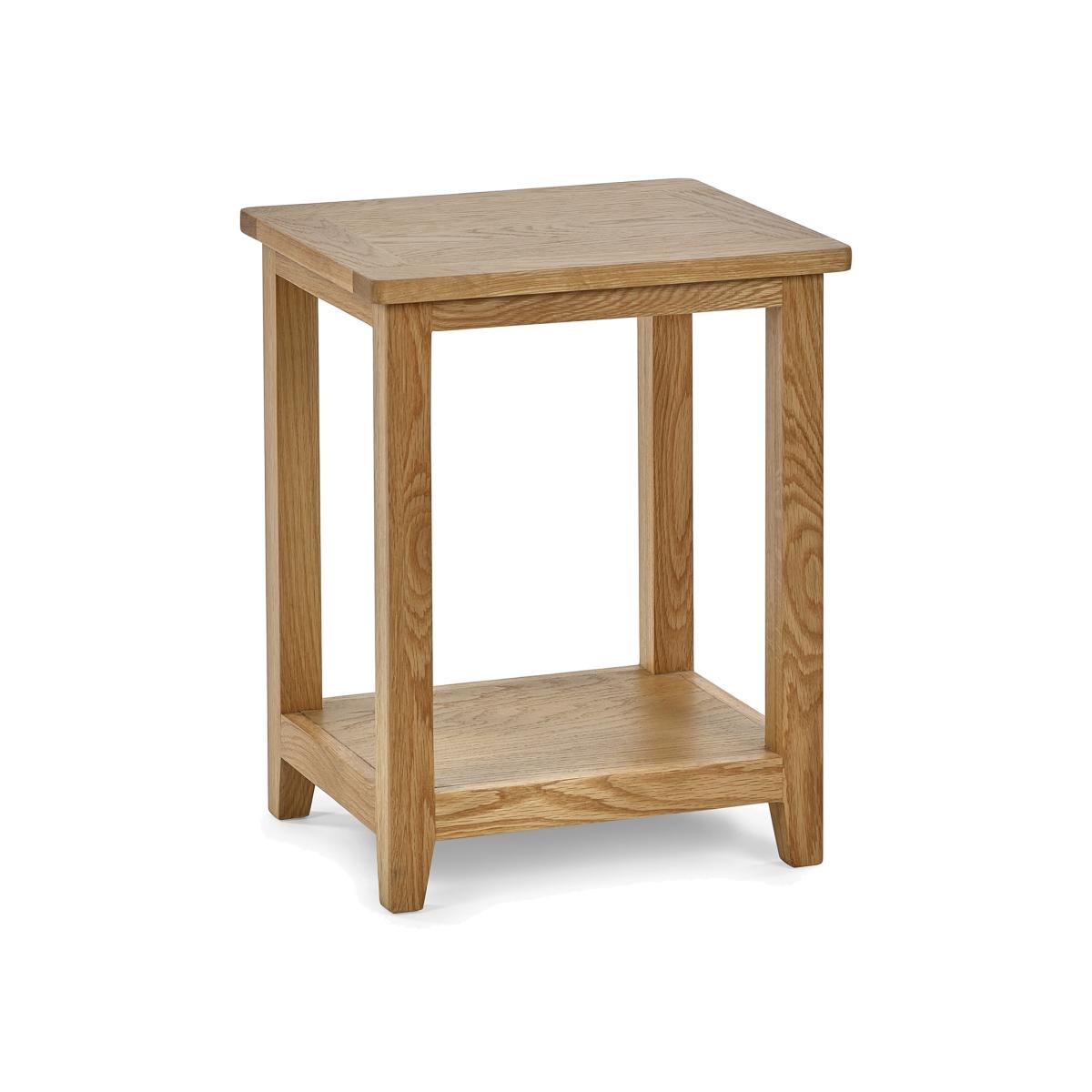 The Mallory Lamp Table is crafted from solid oak and oak veneers giving a simple and stylish design that is perfect for any living space. Durable and timeless, with a shelf below for added storage space.