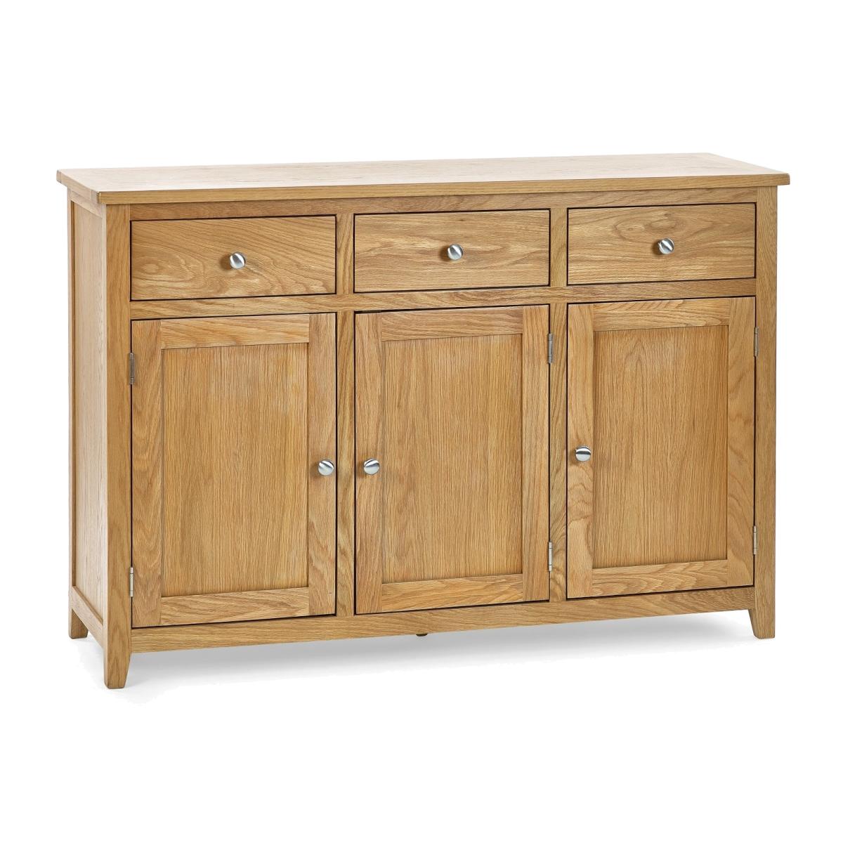 Crafted from solid oak and oak veneers, the Mallory Large Sideboard features 3 drawers and 3 cupboards to neatly store your belongings. The simple, yet stylish design with beautiful silver knobs is the ideal additional to any living space.