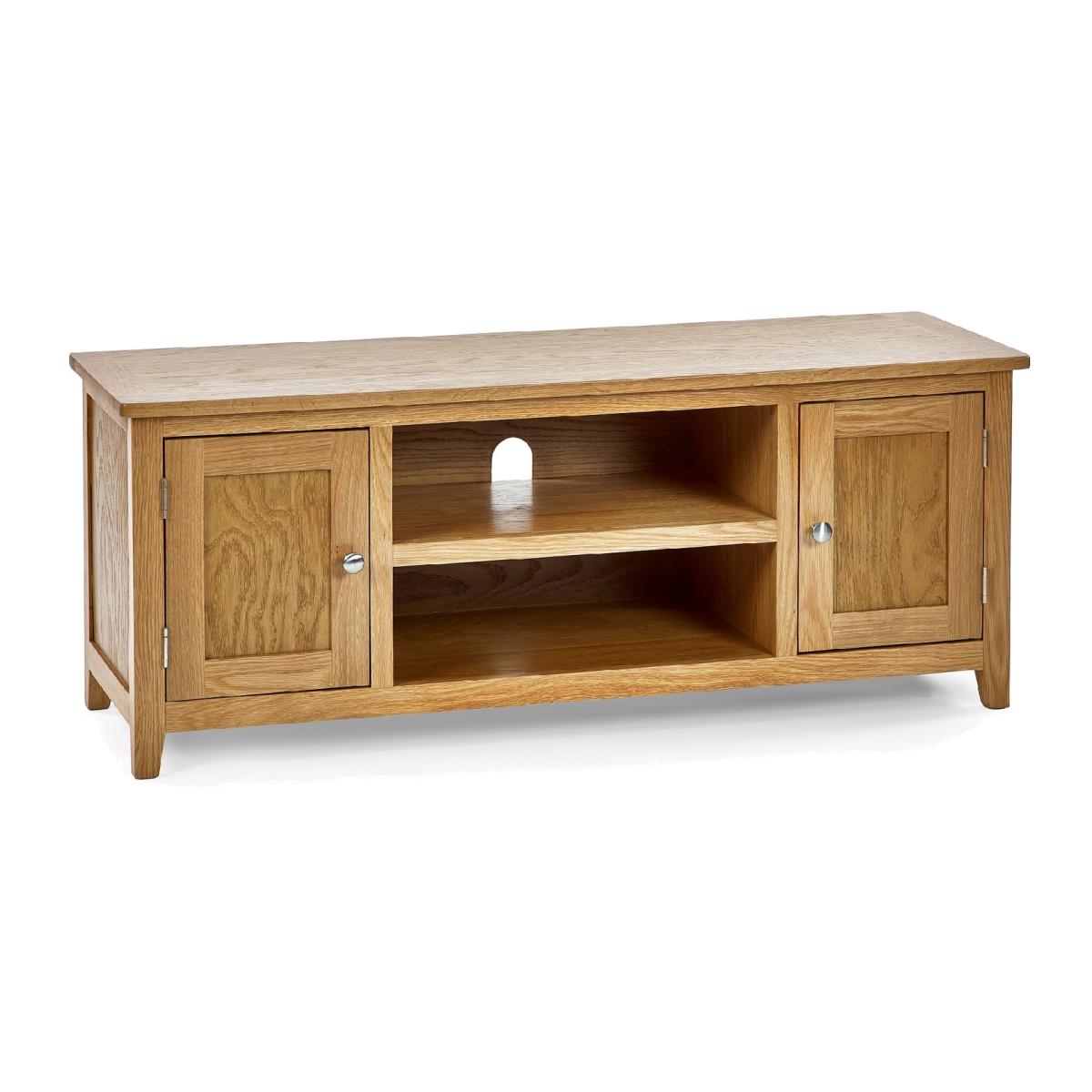 The Mallory Widescreen TV Unit is crafted from solid oak and oak veneers giving a simple and stylish design that complements any living space. Featuring two cupboards and two shelves ideal for storing consoles