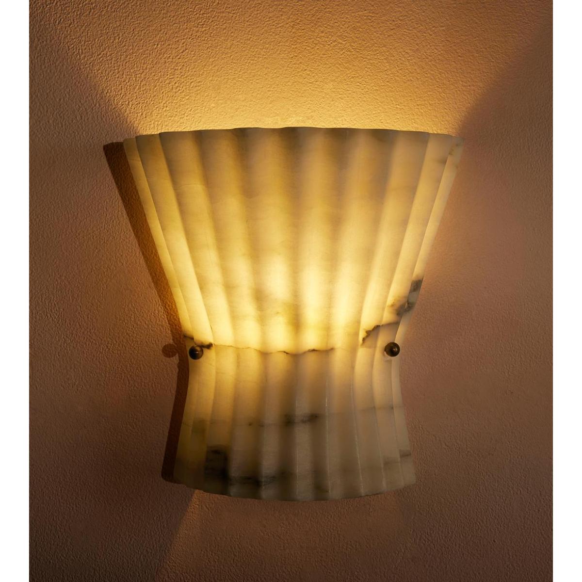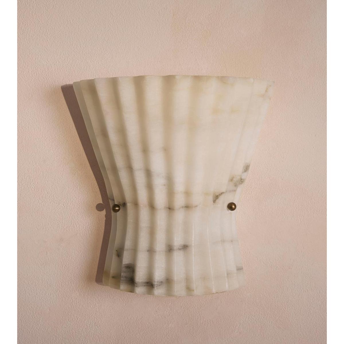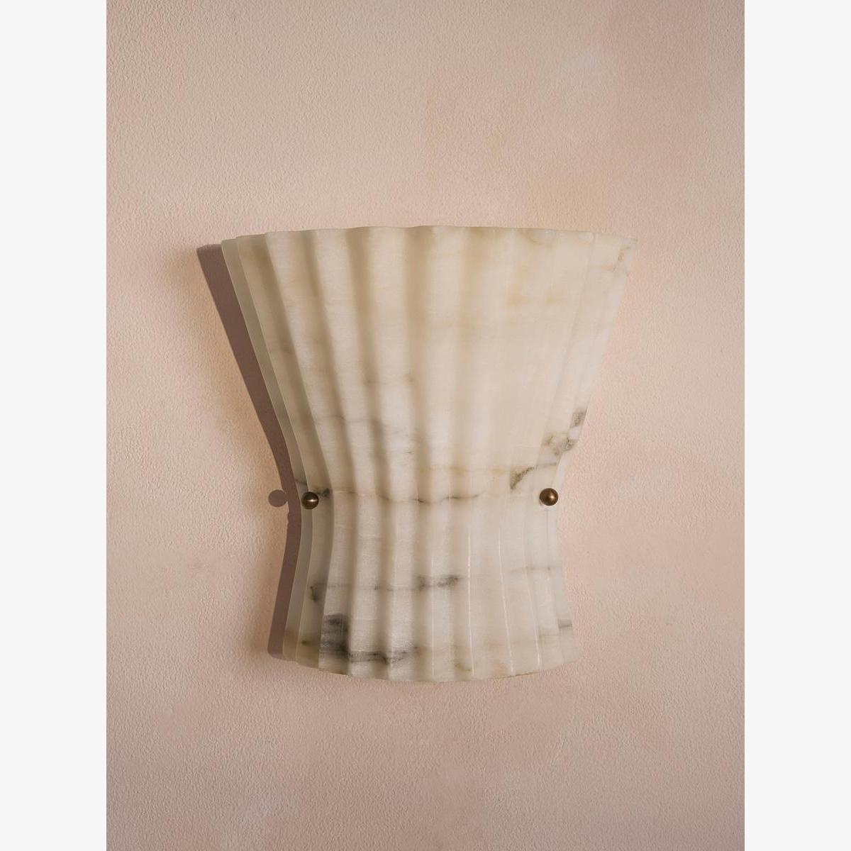 An alabaster marble silhouette, detailed with hand-carved scallops. The gently flared silhouette of our Mallory wall light is detailed with scalloped patternwork carved by hand. An alabaster stone lets the light shine through and is detailed with brass hardware inspired by our Houses.