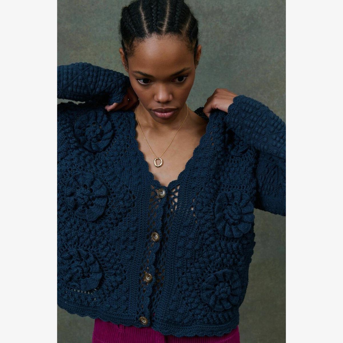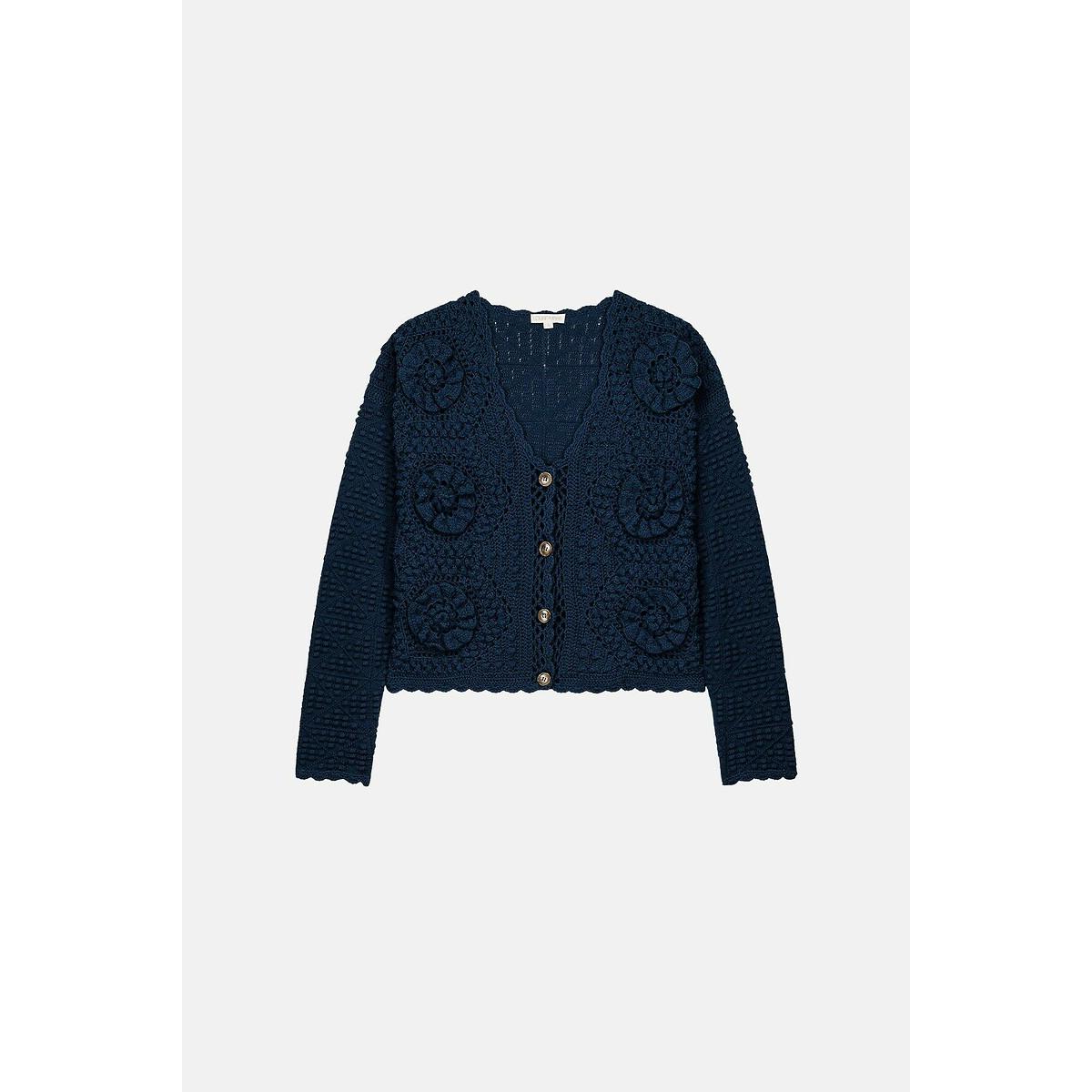 The Louise Misha women's Mallyr cotton cardigan is decorated with crochet flowers. A romantic, boho detail that adds charm to this long sleeve, buttoned cardigan with v-neck. The extra detail : wavy scalloped edging. Product details • V-neck cardigan • Long sleeves • Embroidered • Button fastening • Scalloped edging. Fabric content and care advice • 100% cotton • Please refer to the care instructions on the product label