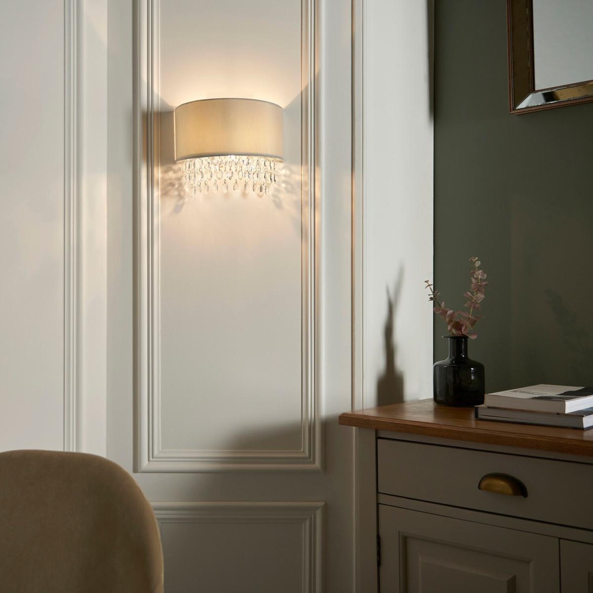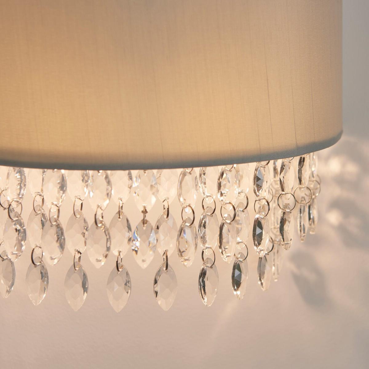 Stunning multi layer wall light with silver grey fabric shade. Complete with double row of facetted glass crystals and dimmable to create a stylish ambience. Matching pendant also available.