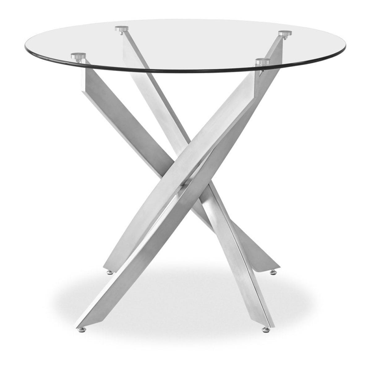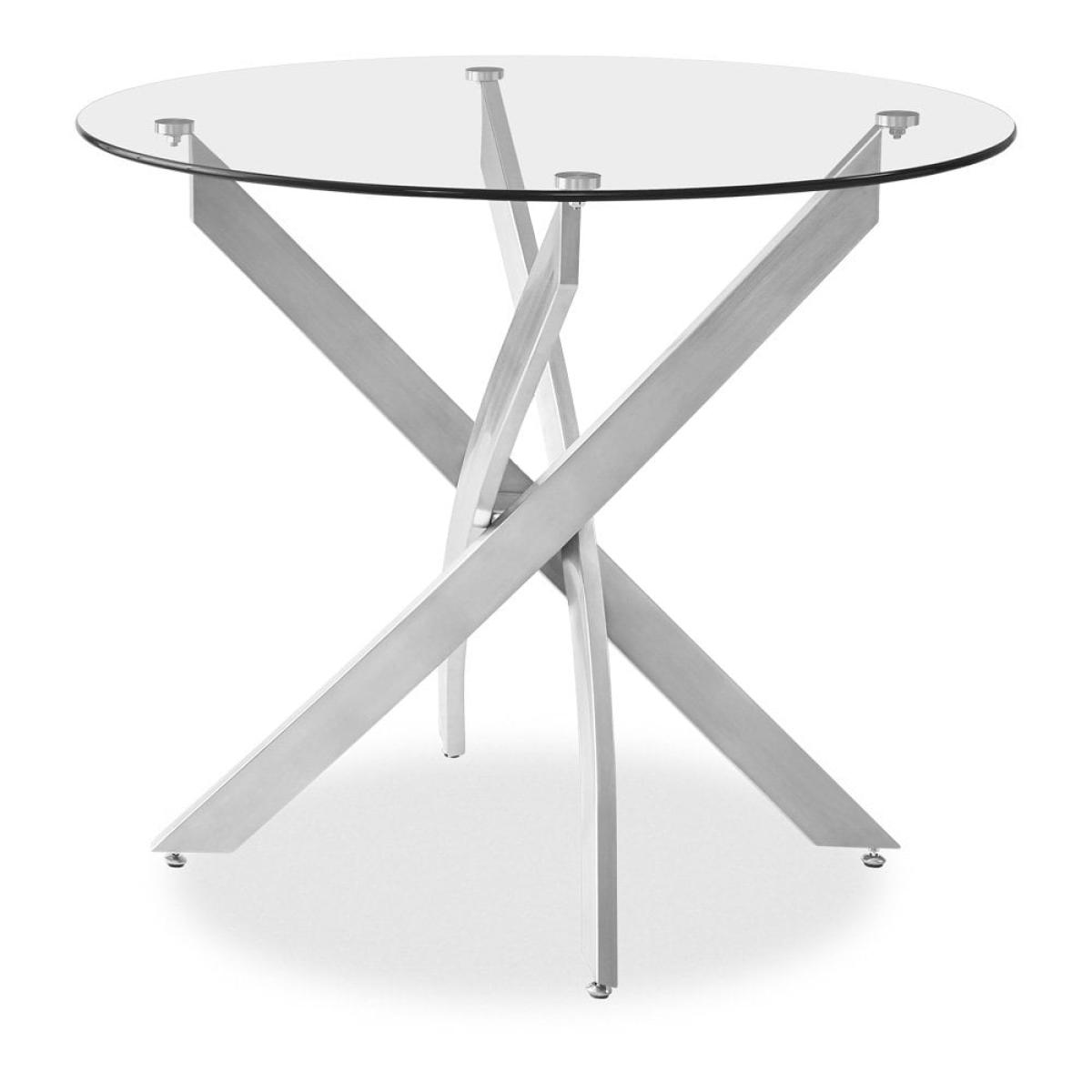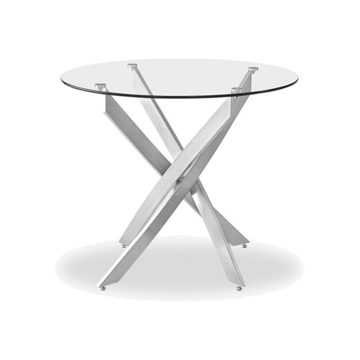 Take your kitchen or dining space to the next level with the Malmo dining table for 4. Perfect for those who want to make a contemporary statement, the Malmo features a round clear glass tabletop and an eye-catching criss-cross brushed metal base.