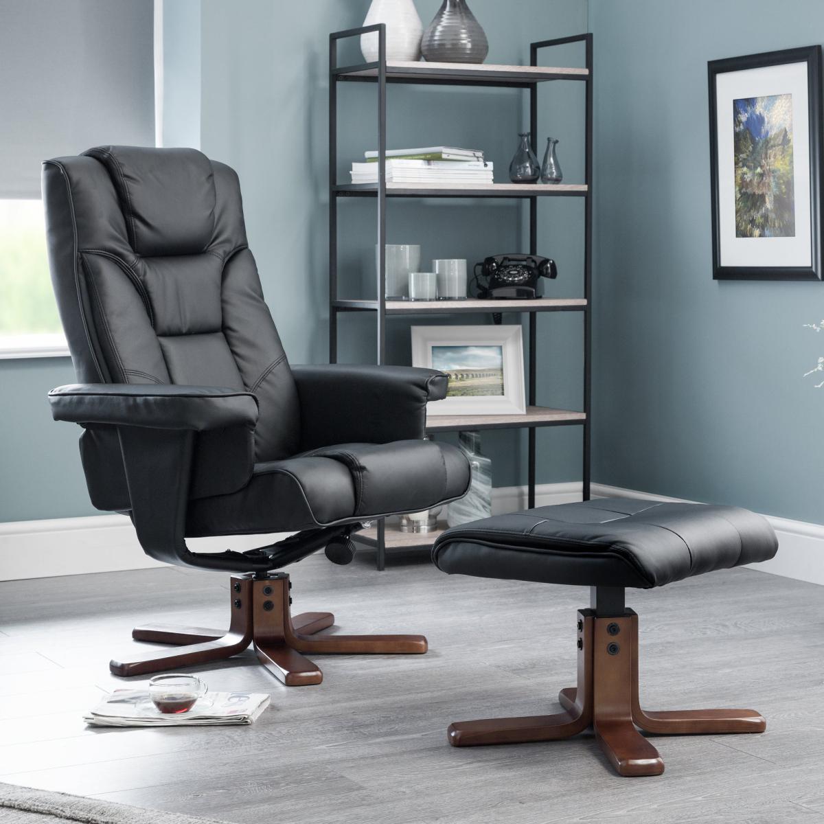 * Modern Recliner Chair and Footstool* Soft Touch Faux Leather Upholstery* Foam-filled Seat and Backrest* Walnut Colour Laminated Base* Swivel and Tilt Function* Part Assembly Required* 1 Year Guarantee The Malmo Faux Leather Recliner Chair and Footstool offers amazing classic style and relaxing comfort. Upholstered in a soft touch faux leather fabric with a walnut colour laminated base. This recliner is designed with a foam filled seat and backrest providing maximum support and comfort as you sit back and relax. Complete with an extra padded headrest, armrests and footstool that add to the cosy feel, whilst the swivel and tilt functions allow you to reach your preferred position at ease. dunelm. com/infodocs/downloads/Furniture-Sizing-Guide. pdf)to check out our handy sizing guide to help you find out if you'll be able to get your new furniture into your home.