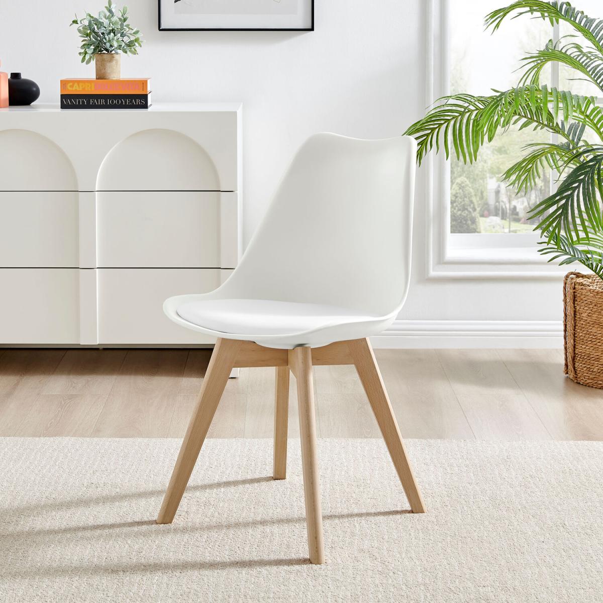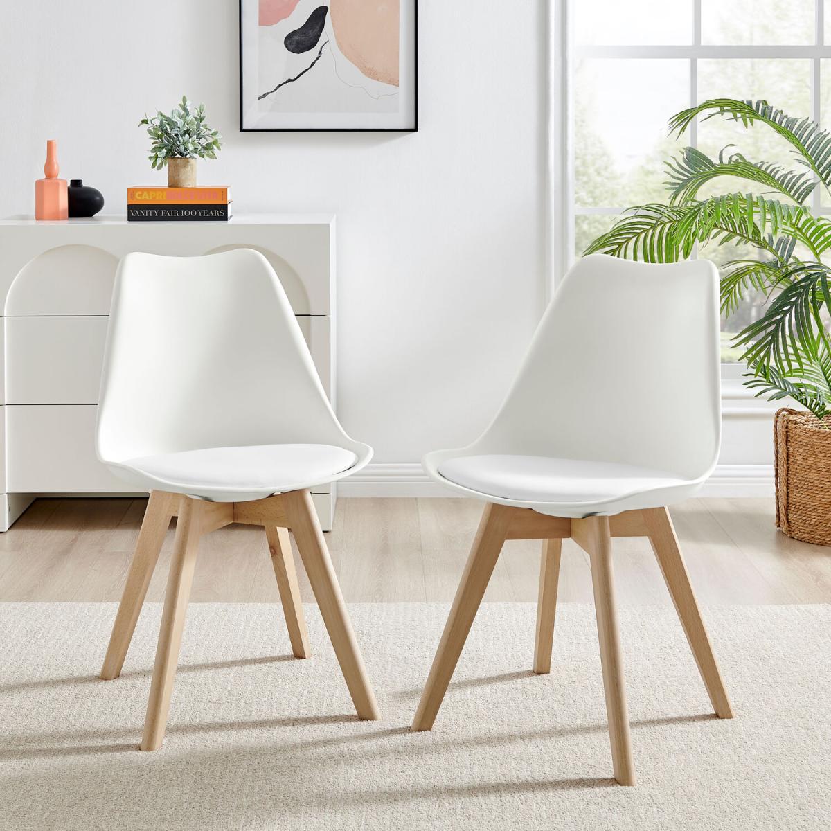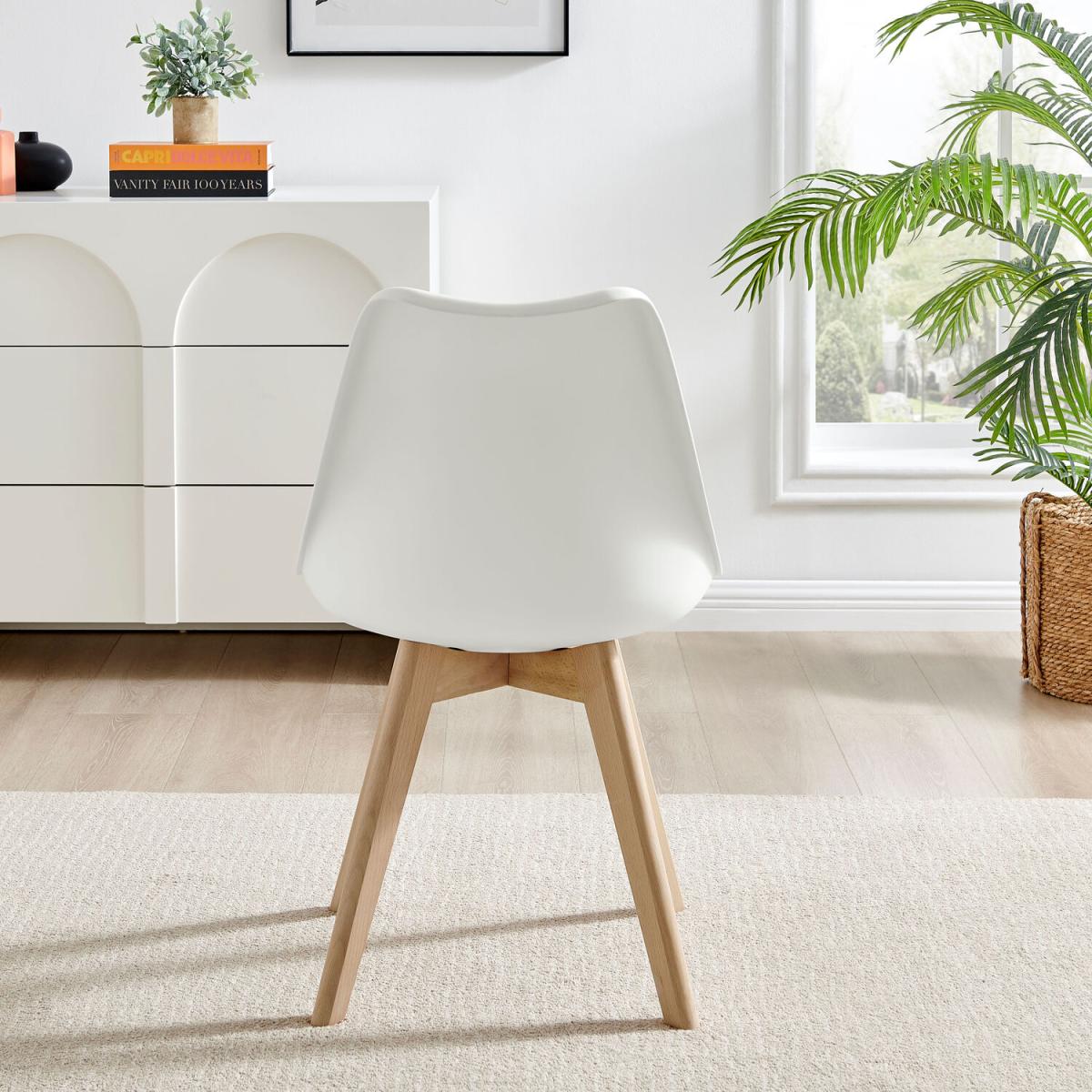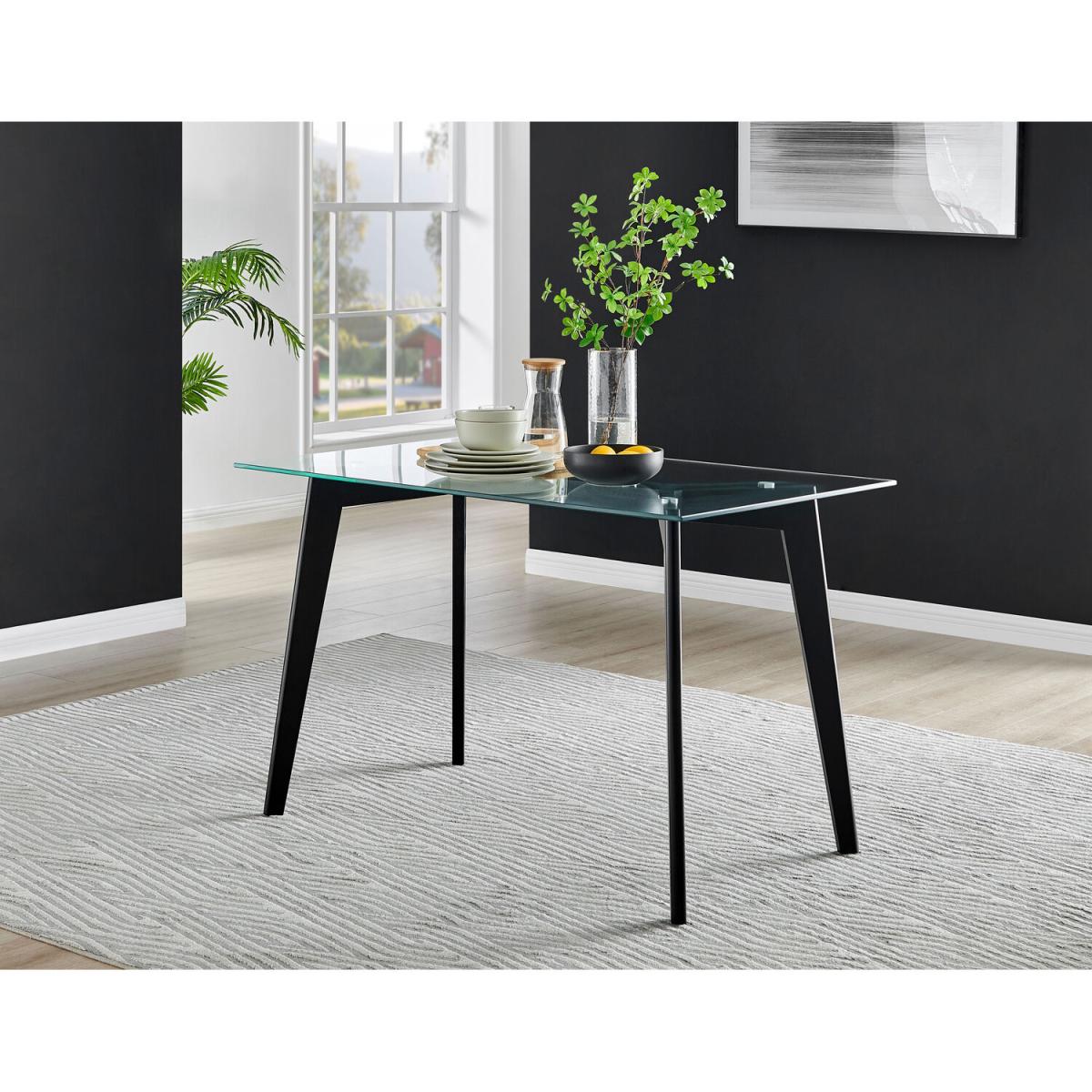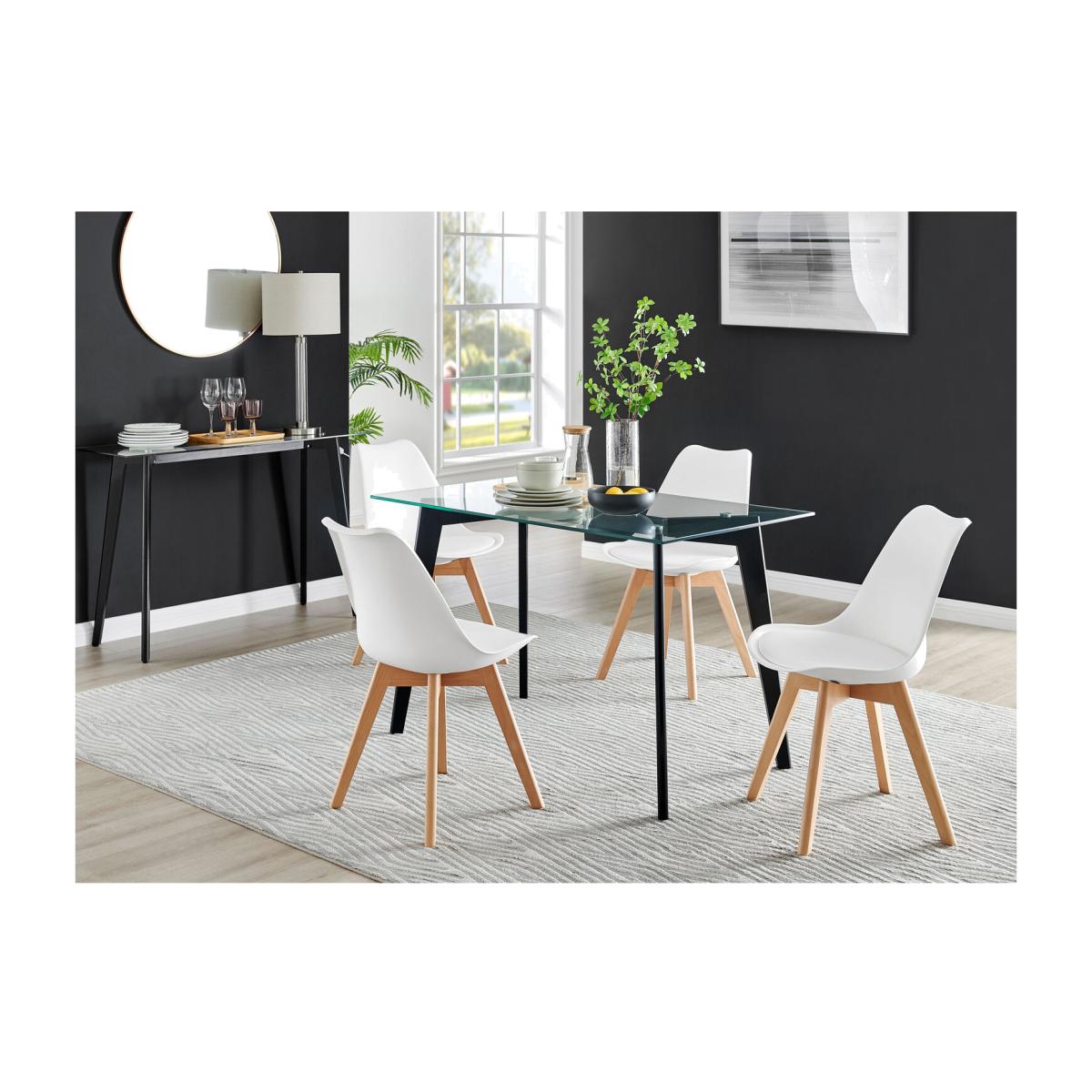 Our Malmo Scandi-inspired rectangular glass dining table features simple and effortless clear glass and black wooden legs, perfect for modern homes. This dinner table has a 1cm thick tempered glass tabletop sat on four angled black beech wood legs with rounded edges. It will comfortably seat 4 so perfect for family dinners or for entertaining guests. This design is all about keeping things unfussy and light with that minimalist Industrial look and laid-back Scandinavian touch. This beautifully designed dining table will set the scene for a stylish and contemporary dining room. Our Stockholm chairs are all about that stripped-back chic Scandi vibe. The simple wooden angled legs look great paired with the faux leather chair and create a stunning but laid-back dining chair that will add some modern minimalist touches to your home and dining area. These chairs are the perfect combination of comfort and original style, suiting almost any wooden dining table. Ergonomically curved chair backs perfectly adapt to the shape of your body providing brilliant comfort. The wooden legs not only add to the aesthetic but provide stability for use in a variety of environments. Our designs are fantastic value for money and are sure to give any dining room a touch of class, or make a great one off style statement