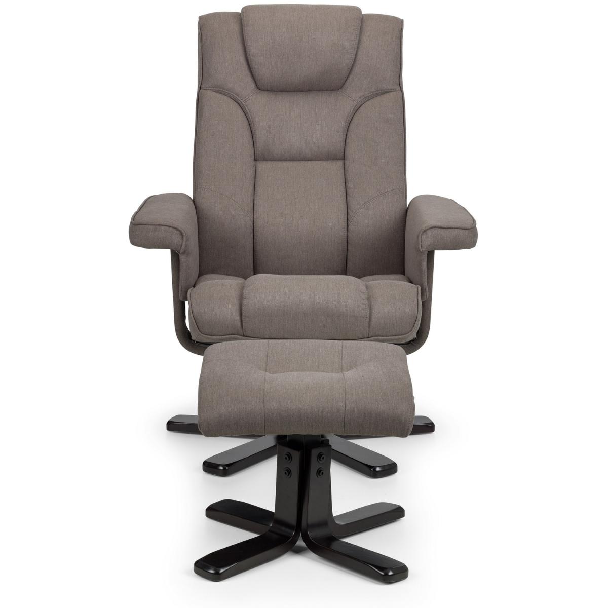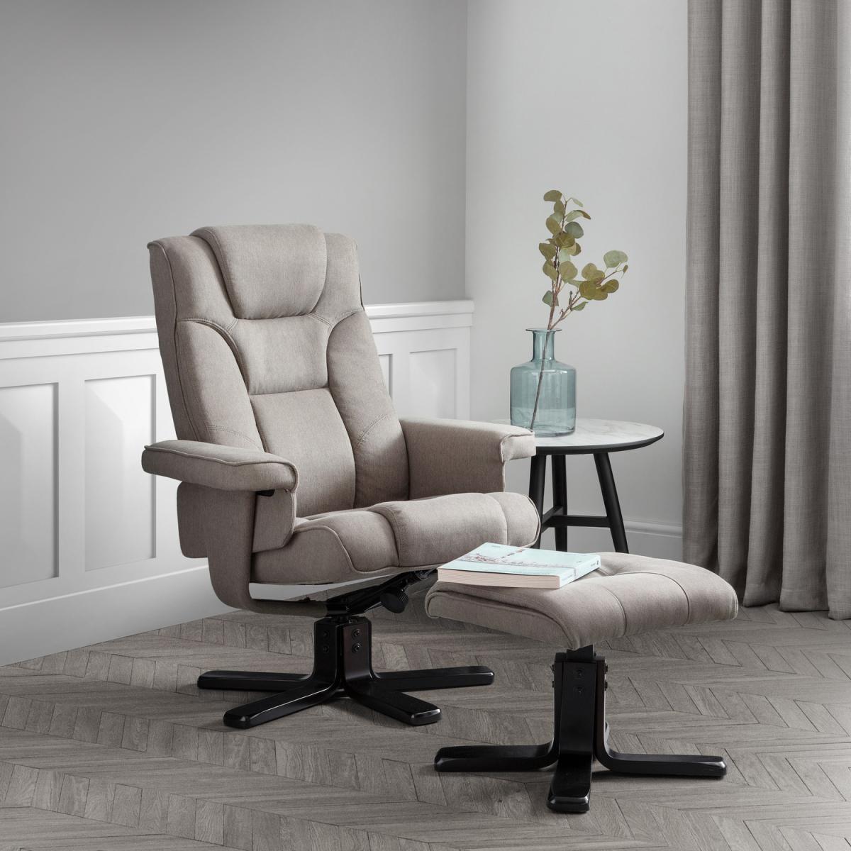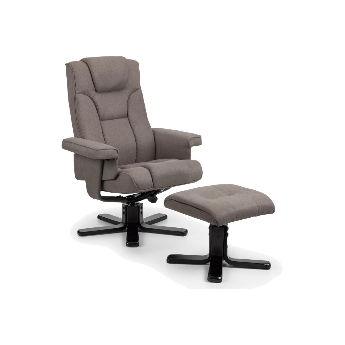 The Malmo reclining swivel chair and stool is upholstered in a grey linen fabric with a black colour laminated base. This chair offers the ultimate in complete sitting comfort and relaxation.
