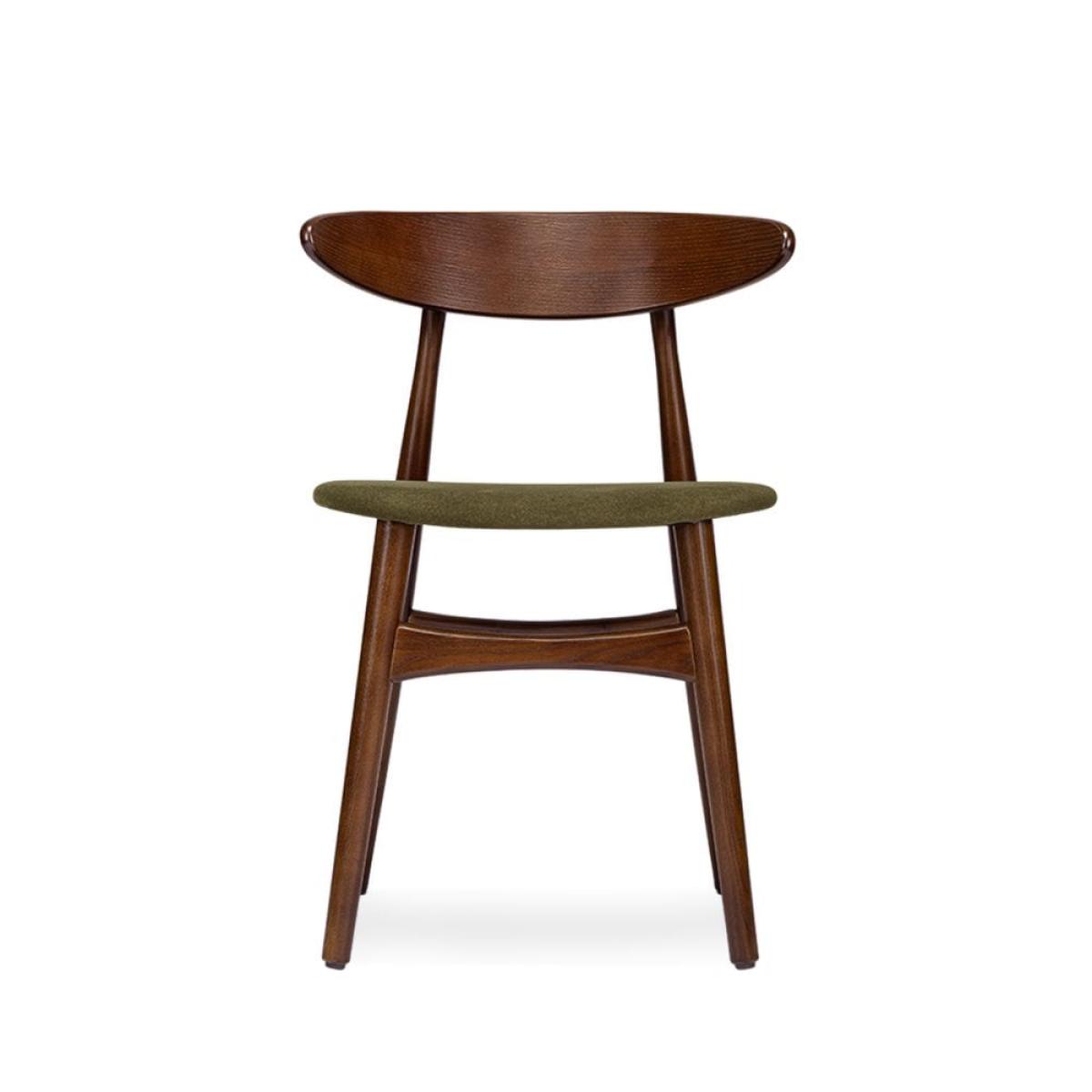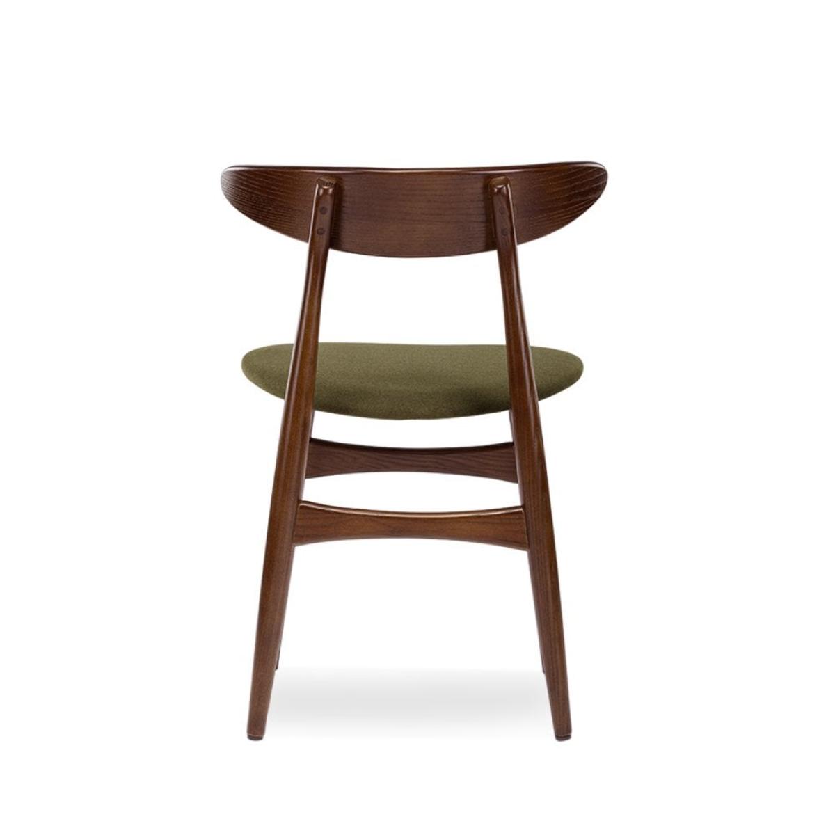 Smooth walnut-stained ash wood, mohair velvet seat, and tapered legs - the Malmros wooden dining chair in moss green is a stylish mid-century addition to your dining room or kitchen space. We love how the curved backrest and soft padded seat add elegance to any dining room without compromising comfort. For a rich depth of colour and unique softness, our velvet used in this product is not only of the highest quality but is made from 100% recycled PET yarns so it is kinder to the environment too.