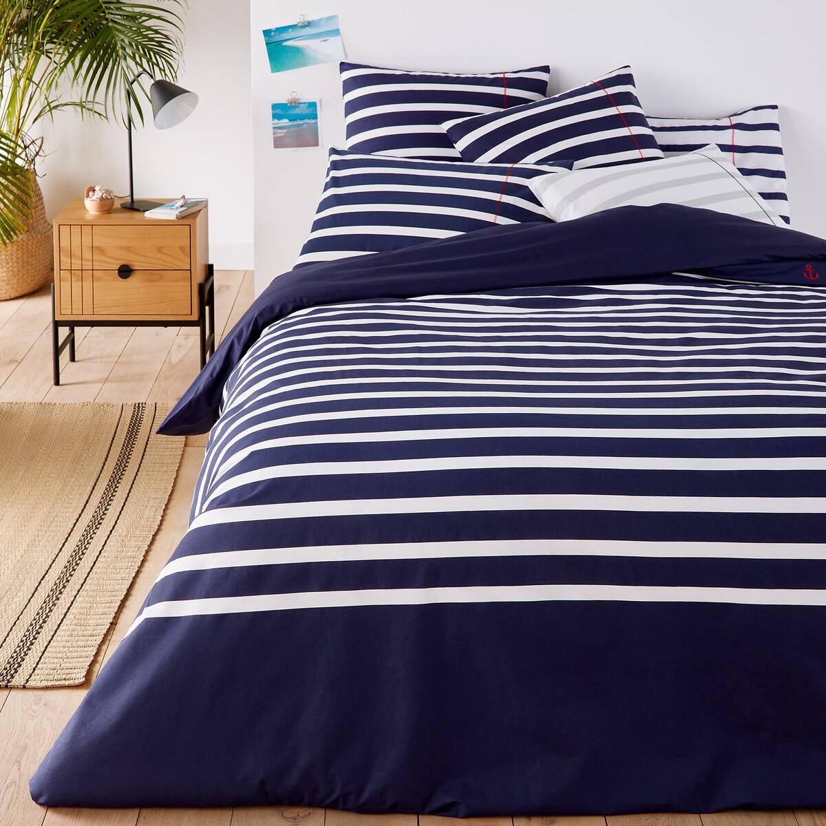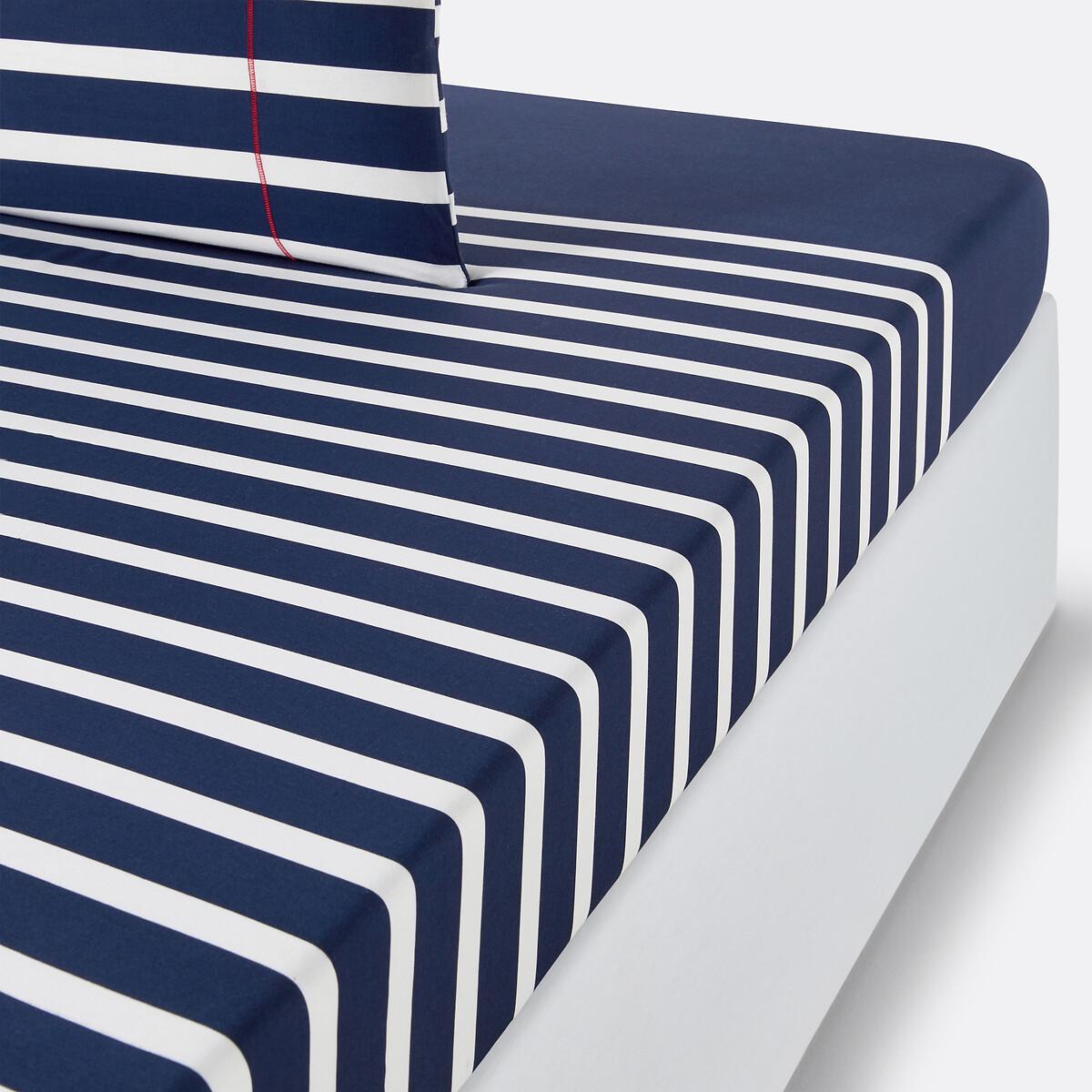 The Malo cotton fitted sheet. Nautical styling for the bedroom. ! Cotton is part of our daily lives. We love it for its suppleness and softness. Easy Care, it is ideal for the beds of young and old alike!Product Details • 100% cotton • 144 thread count • For mattress height 25cm • Marine striped print. Care Advice • Machine washable at 60°C • By washing your laundry at 40°C instead of 60°C, you limit energy consumption. Dimensions • 90 x 190cm • 140 x 190cm • King (160 x 200cm) • 180 x 200cm • OEKO-TEX® Standard 100. Standard 100 certification by OEKO-TEX® tests textile products for harmful substances via an independent, international label.