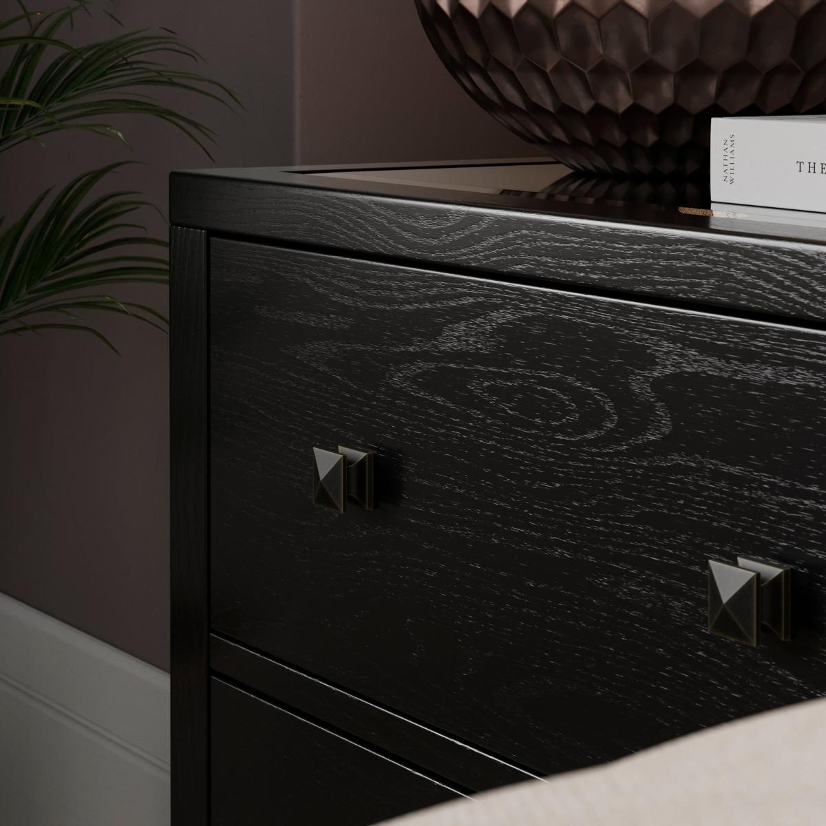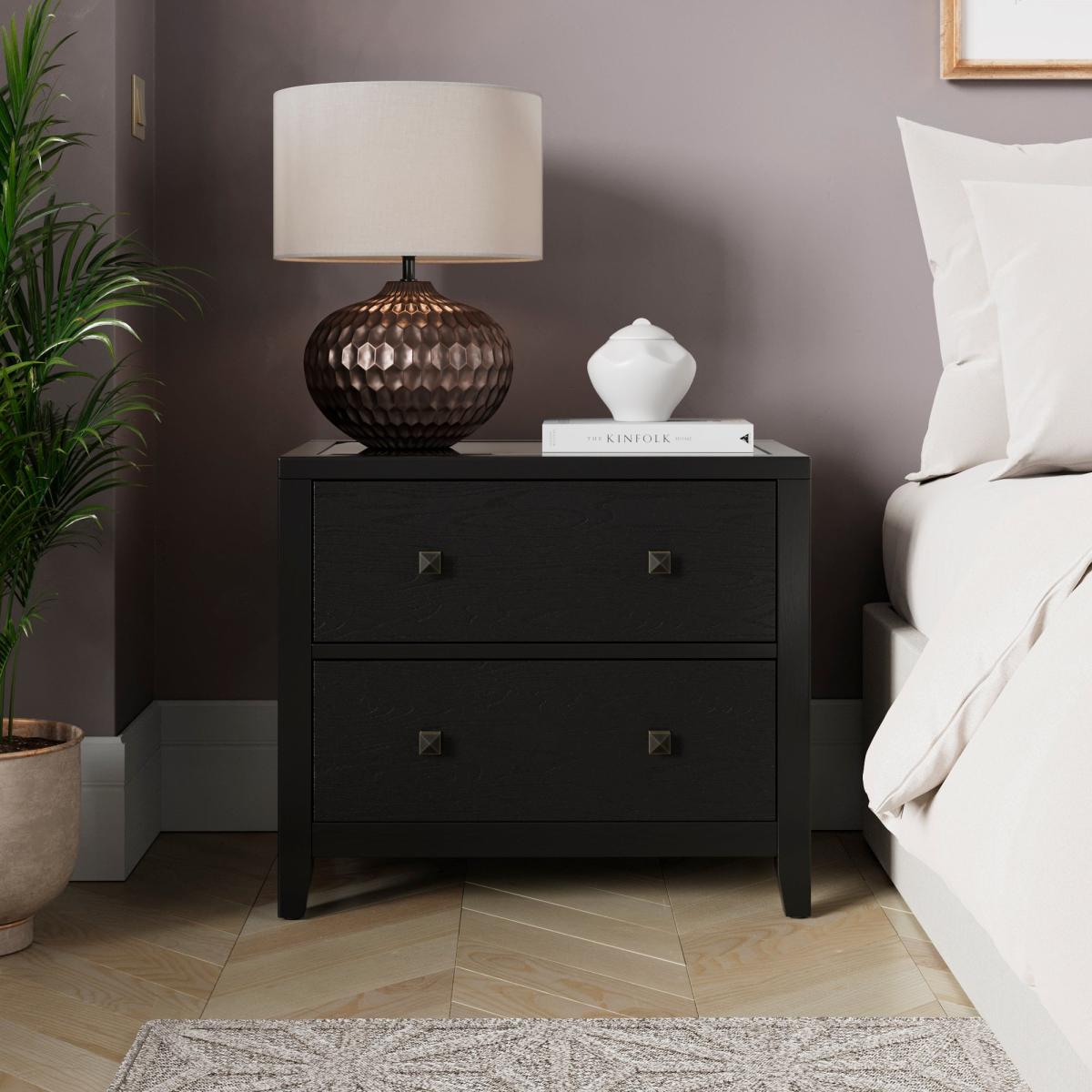 I’m a fan of this wide bedside because its clean lines and matt black finish make it a versatile piece that works equally well in modern, Scandi or industrial-inspired bedrooms. The generous drawers keep clutter out of sight, while the compact footprint suits smaller rooms. For styling, balance its dark tone with soft textiles and warm metallics - try a ceramic lamp in amber or brass, a stack of books or a small planter for texture. Keep bedside essentials in the lower drawer and use the top surface for a coaster, a reading light and a slim vase to maintain a neat, pulled-together look.