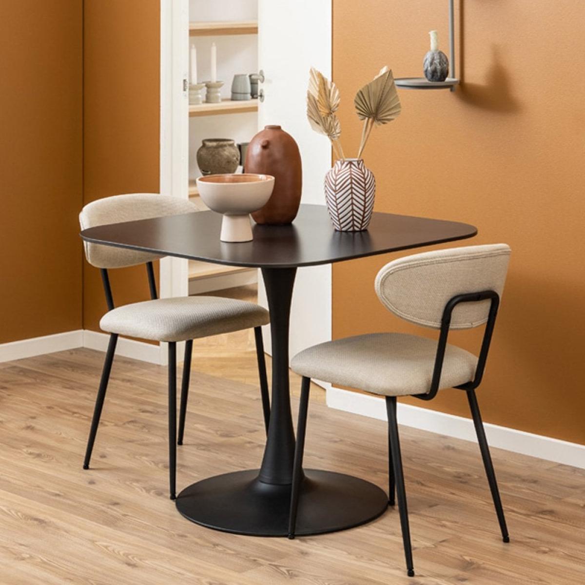 I love this sleek black ceramic table for its modern yet versatile appeal. It works particularly well in contemporary settings, especially those that favour monochrome schemes or minimalistic design. Its durable surface makes it practical for everyday use, while the simplicity of the shape allows for easy styling with a variety of chairs and accessories. For a fresh look, pair it with neutral or textured textiles and metallic or matte finishing accessories. In smaller spaces, it helps create a clean, uncluttered dining area, but it can also anchor larger open-plan rooms when styled thoughtfully. Overall, it's a well-rounded piece that combines practicality with a sophisticated aesthetic.