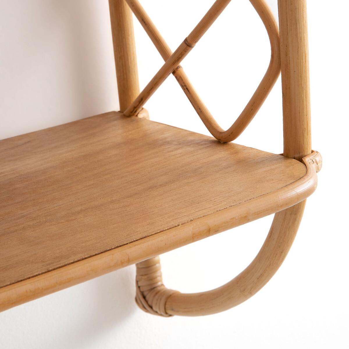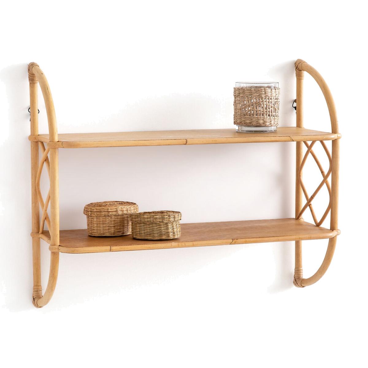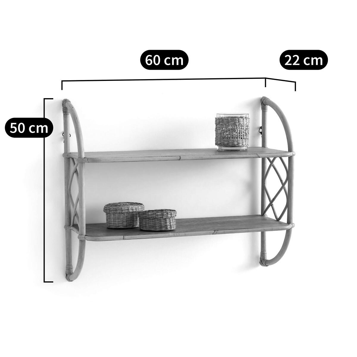 The Malu vintage-style cane shelf. This alluring shelf has plenty of charm thanks to its natural style and original design. Product Details • Made from rattan • 2 tiers • 2 hooks for wall fixing (screws and plugs not supplied) • Supplied pre-assembled. Dimensions • L60 x D22 x H50cm • Height between the 2 tiers : 20cm Parcel dimensions and weight1 parcel • 64 x 54 x 26cm • 3.4kg