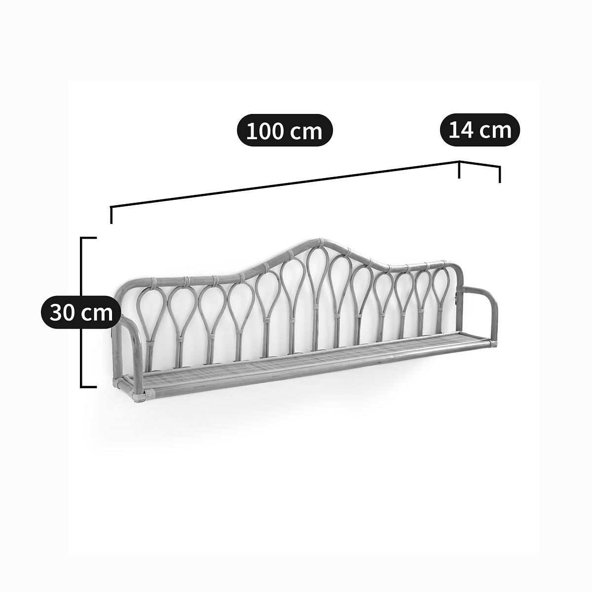 Vintage look, bohemian style and artisanal manufacturing, this is the Malu shelf! Ideal for showcasing your favourite decorative objects or storing your books. Very on-trend, rattan is now present everywhere. Product Details • Made from rattan • Fixings in iron • To be fixed to the wall (screws and plugs not supplied)Quality Info • Handcrafted, each shelf is unique: colours and dimensions may vary from product to product. Dimensions • Length: 100cm • Max height: 30cm • Depth: 14cm