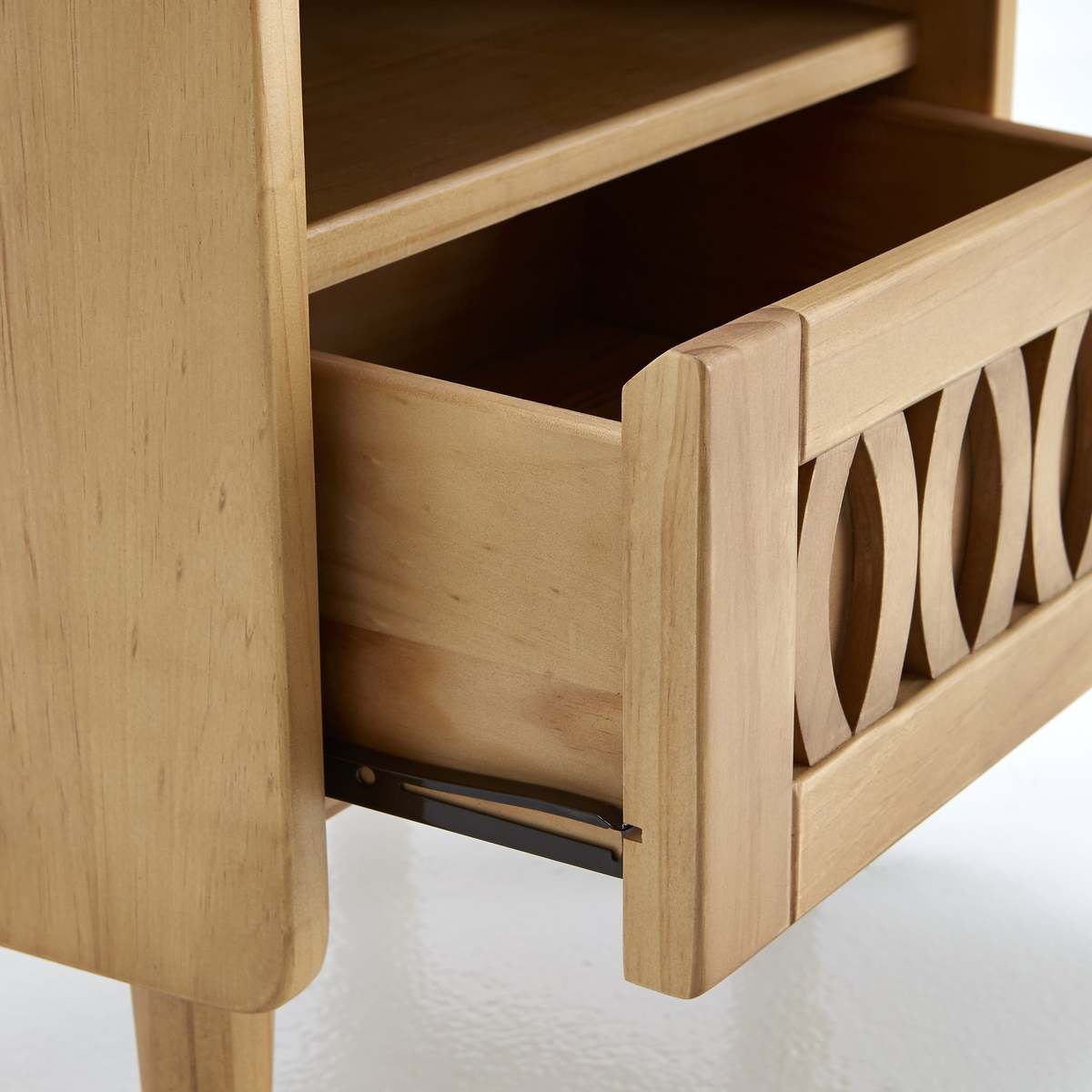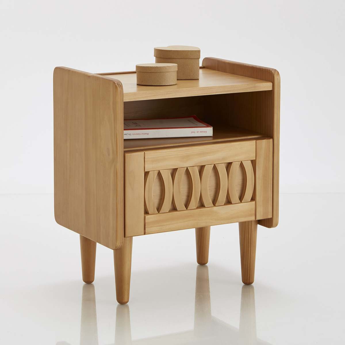 I love the retro charm of this bedside table, making it a versatile piece that can complement a range of interiors from Scandi to boho. Its natural wood finish and simple silhouette work well in both warmer, neutral palettes and more colourful settings. For styling tips, pair it with a cosy lamp or a few curated accessories like a small plant or minimalist clock to keep the surface clutter-free. The drawer and open shelf provide practical storage, perfect for organising bedtime essentials or displaying favourite books and decorative items. This piece would sit beautifully next to a mid-century style bed or even in a minimalist bedroom, adding warmth and character without overwhelming the space.