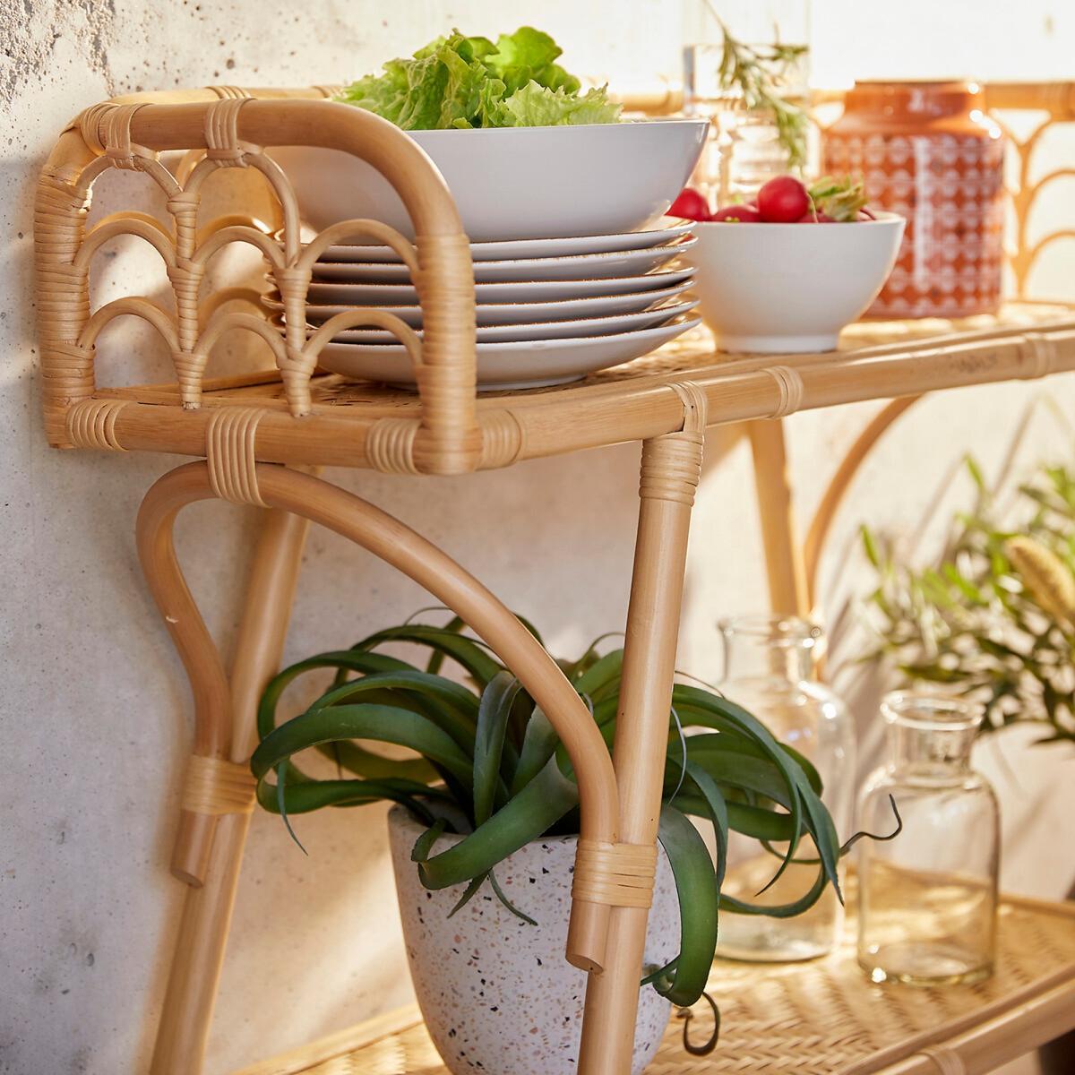 I love this vintage rattan console for its blend of natural texture and timeless charm. It works beautifully in both coastal and bohemian interiors, adding warmth without overpowering the space. Practical styling tips include using it as a statement piece in an entryway with a decorative tray and some small accessories, or as a light organiser in a living room with a mix of decorative objects and plants. Its open design makes it versatile, so pairing it with soft textiles, greenery, or even colourful ceramics can help create a welcoming, curated look. This piece is perfect for adding a touch of relaxed elegance to any space.
